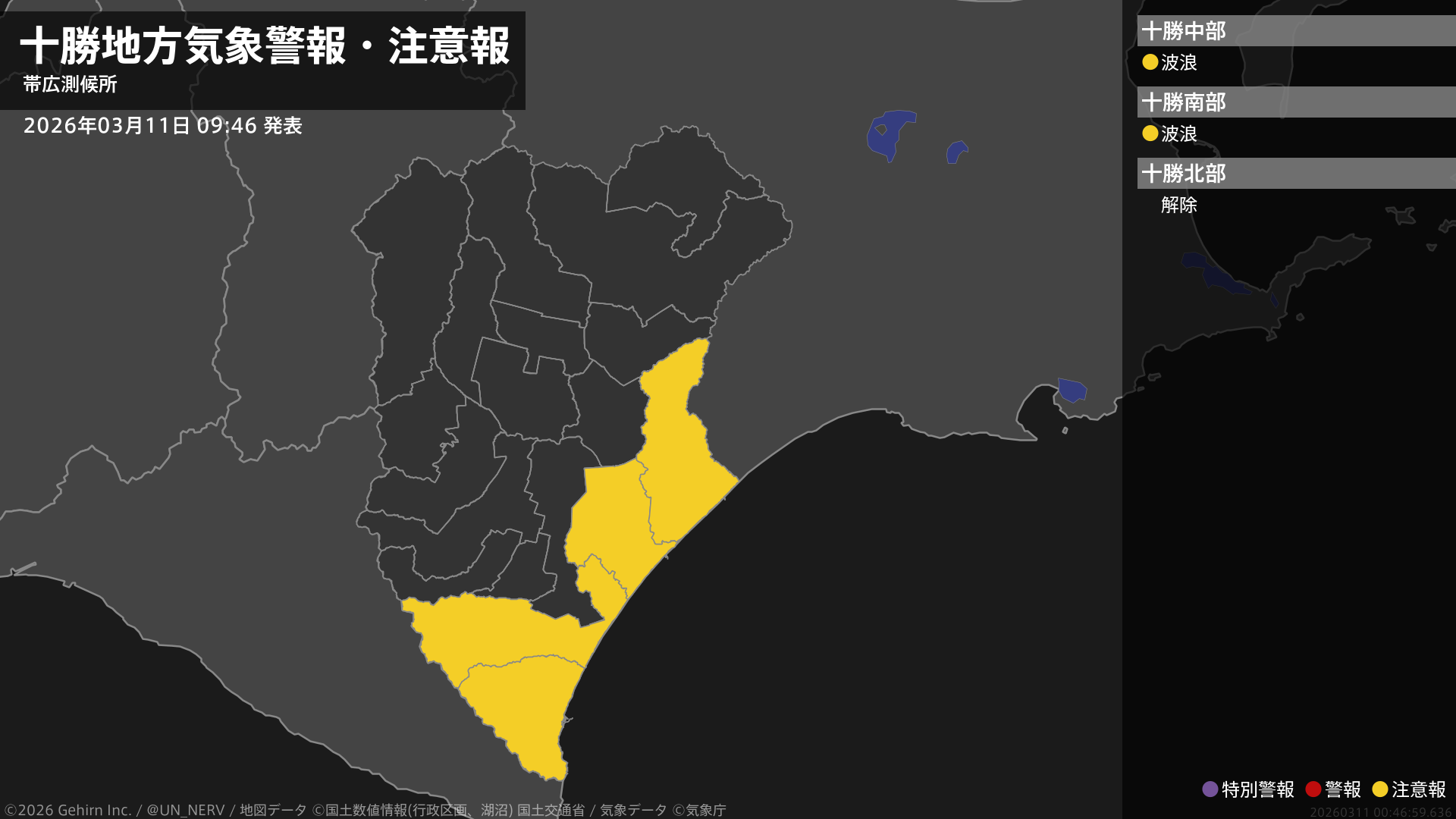 【十勝地方 気象警報・注意報 2026年03月11日 09:47】