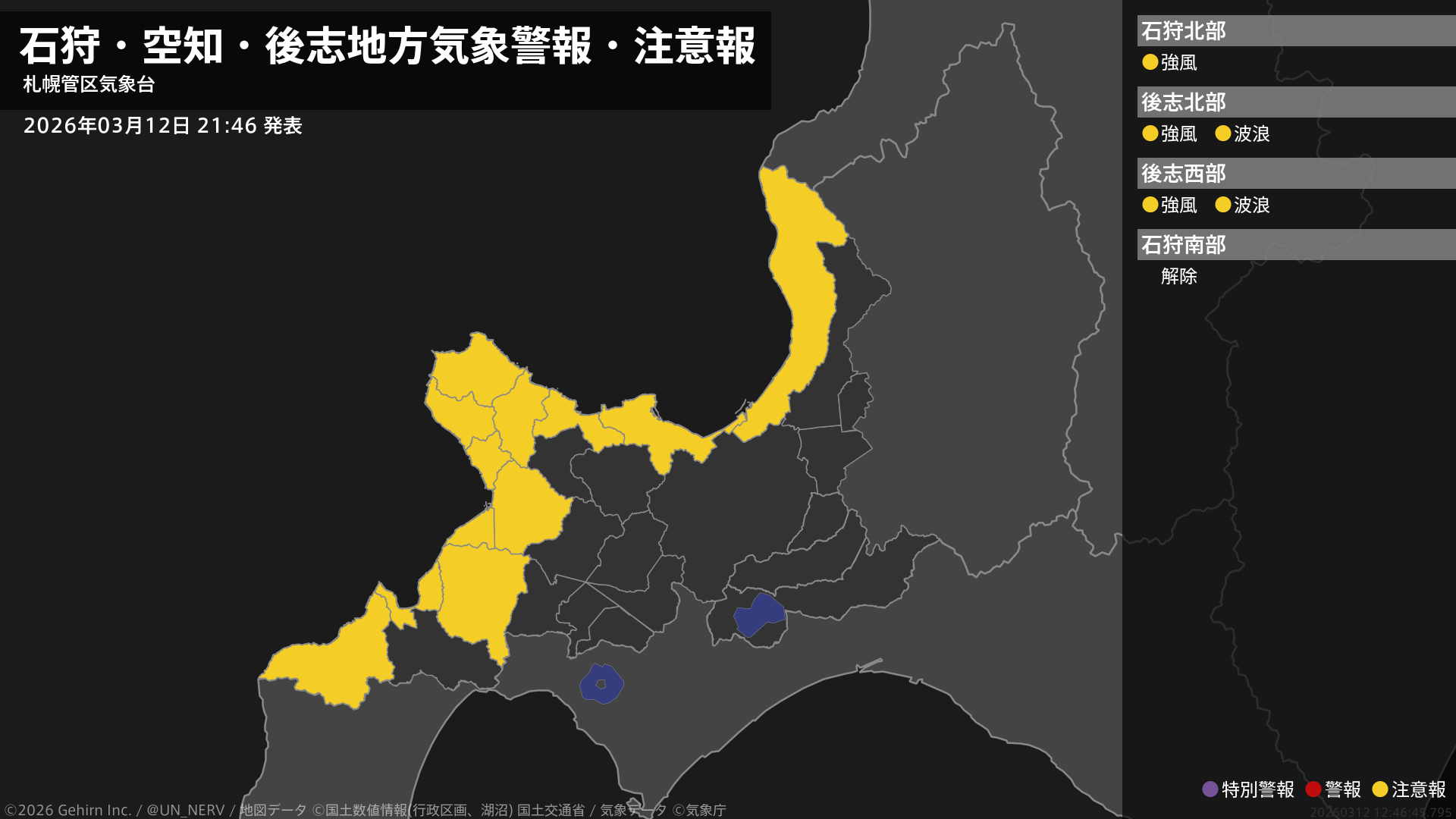 【石狩・空知・後志地方 気象警報・注意報 2026年03月12日 21:46】石狩、後志地方では、13日明け方まで強風に注意してください。後志地方では、13日未明から13日夜遅くまで高波に注意してください。#気象警報注意報 #石狩地方 #後志地方