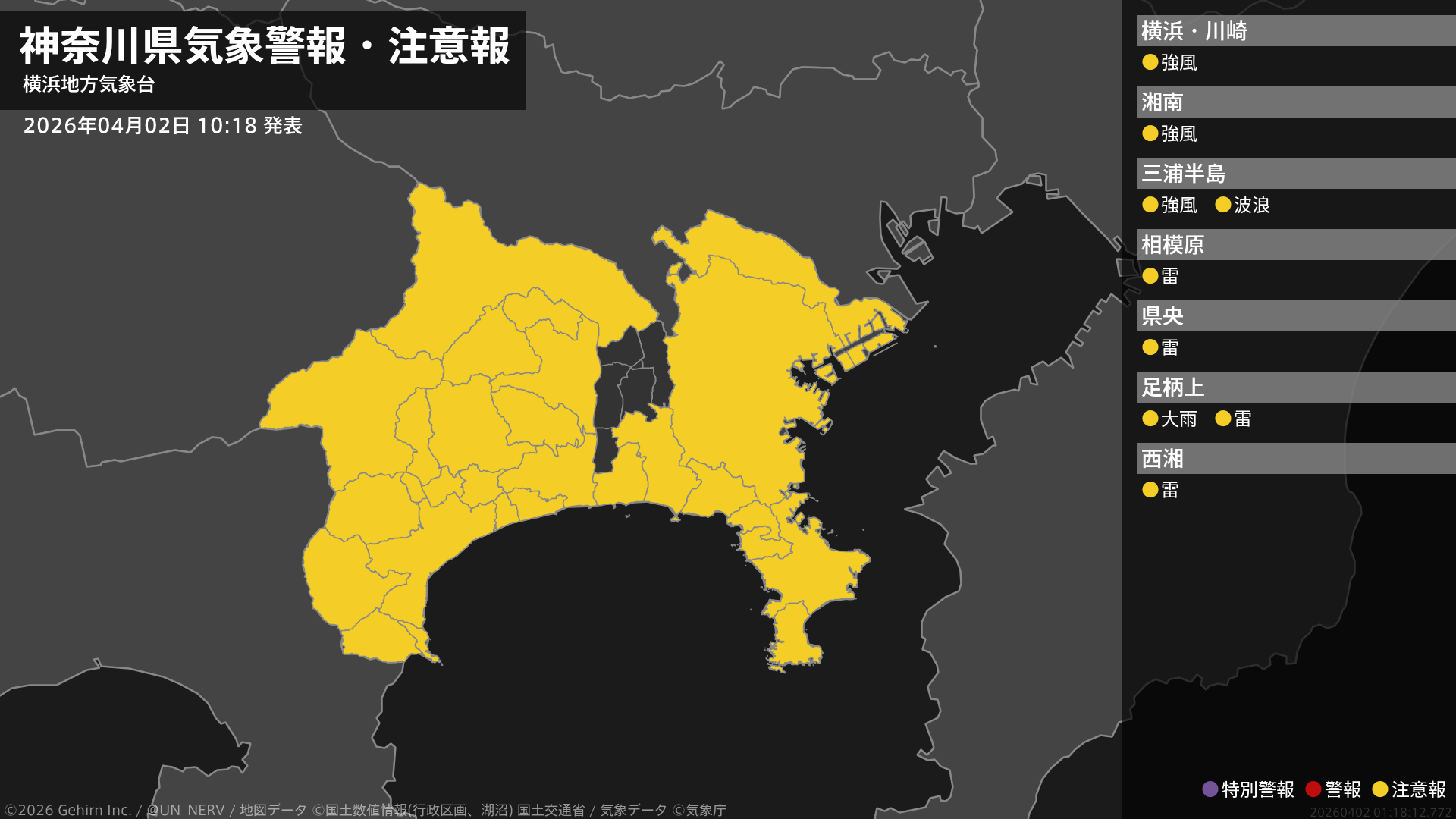 【神奈川県 気象警報・注意報 2026年04月02日 10:18】西部では、2日昼過ぎまで土砂災害や落雷に注意してください。東部では、2日昼過ぎから2日夜遅くまで強風に、2日夜遅くまで高波に注意してください。#気象警報注意報 #神奈川県
