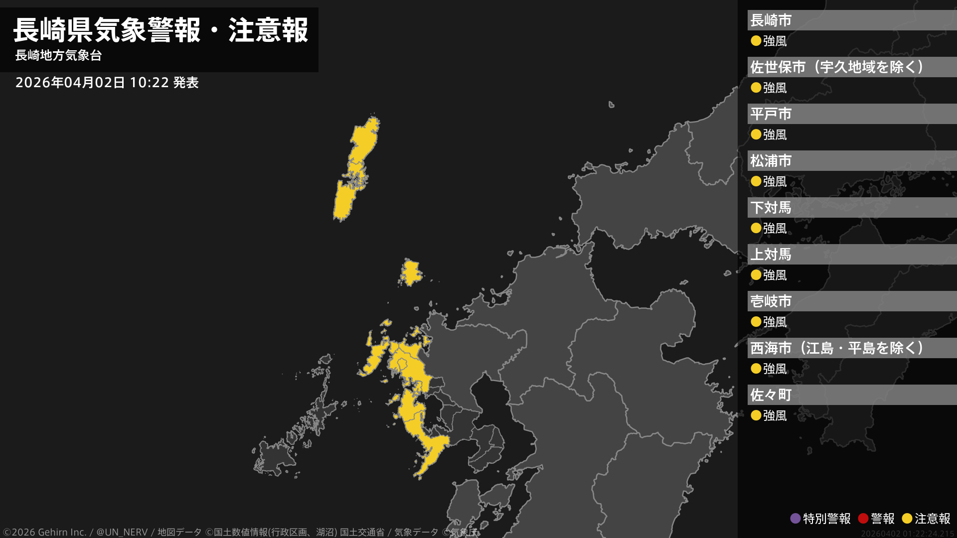 【長崎県 気象警報・注意報 2026年04月02日 10:22】南部、北部では2日夕方まで、壱岐・対馬では2日夕方から2日夜遅くまで、強風に注意してください。#気象警報注意報 #長崎県