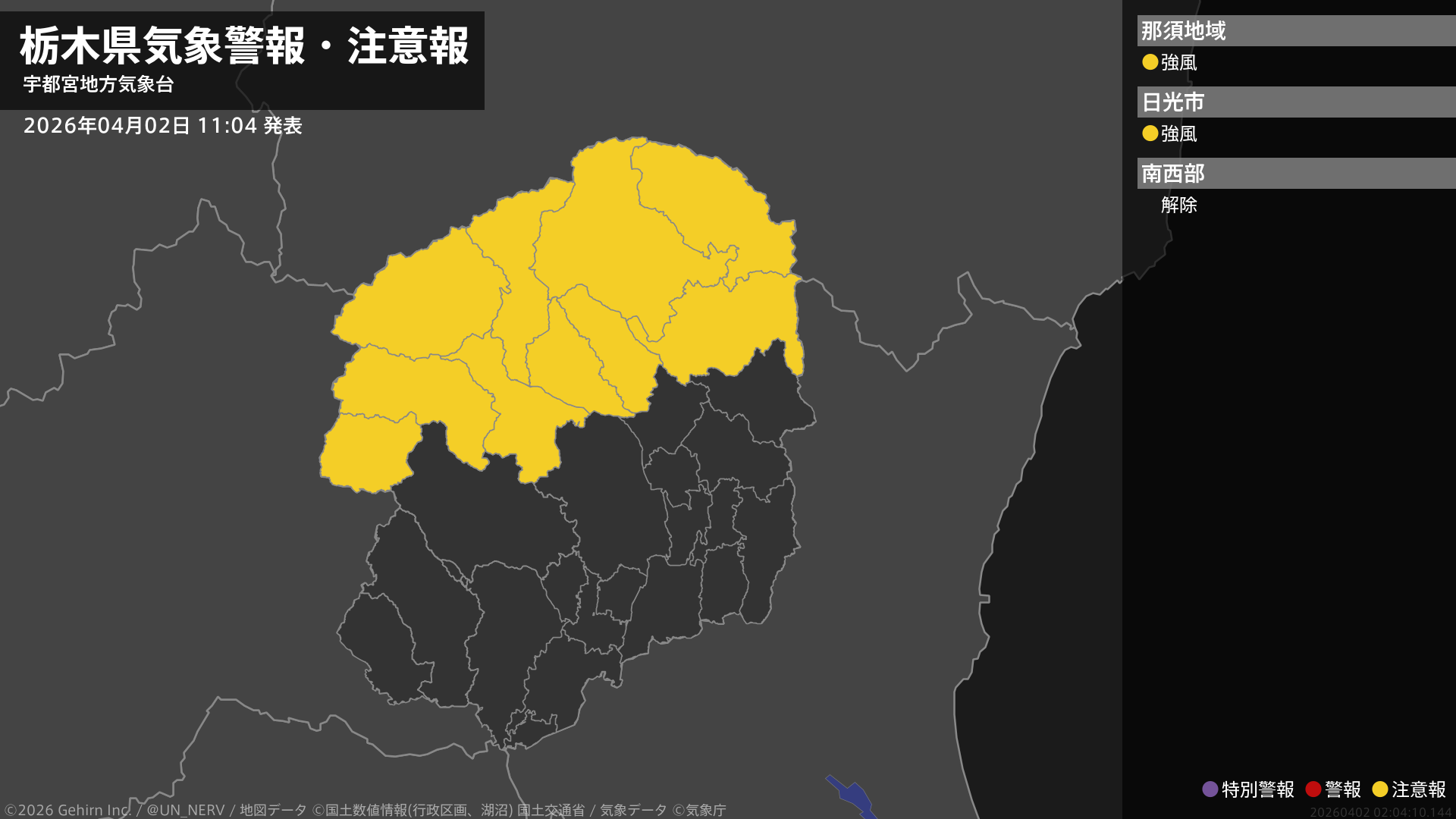 【栃木県 気象警報・注意報 2026年04月02日 11:04】北部では、2日夕方まで強風に注意してください。#気象警報注意報 #栃木県