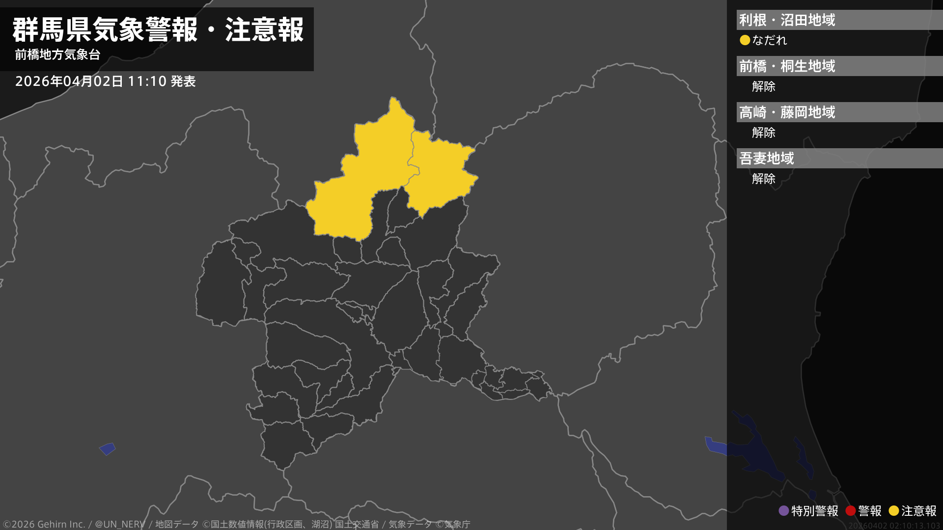 【群馬県 気象警報・注意報 2026年04月02日 11:10】北部では、4日までなだれに注意してください。#気象警報注意報 #群馬県