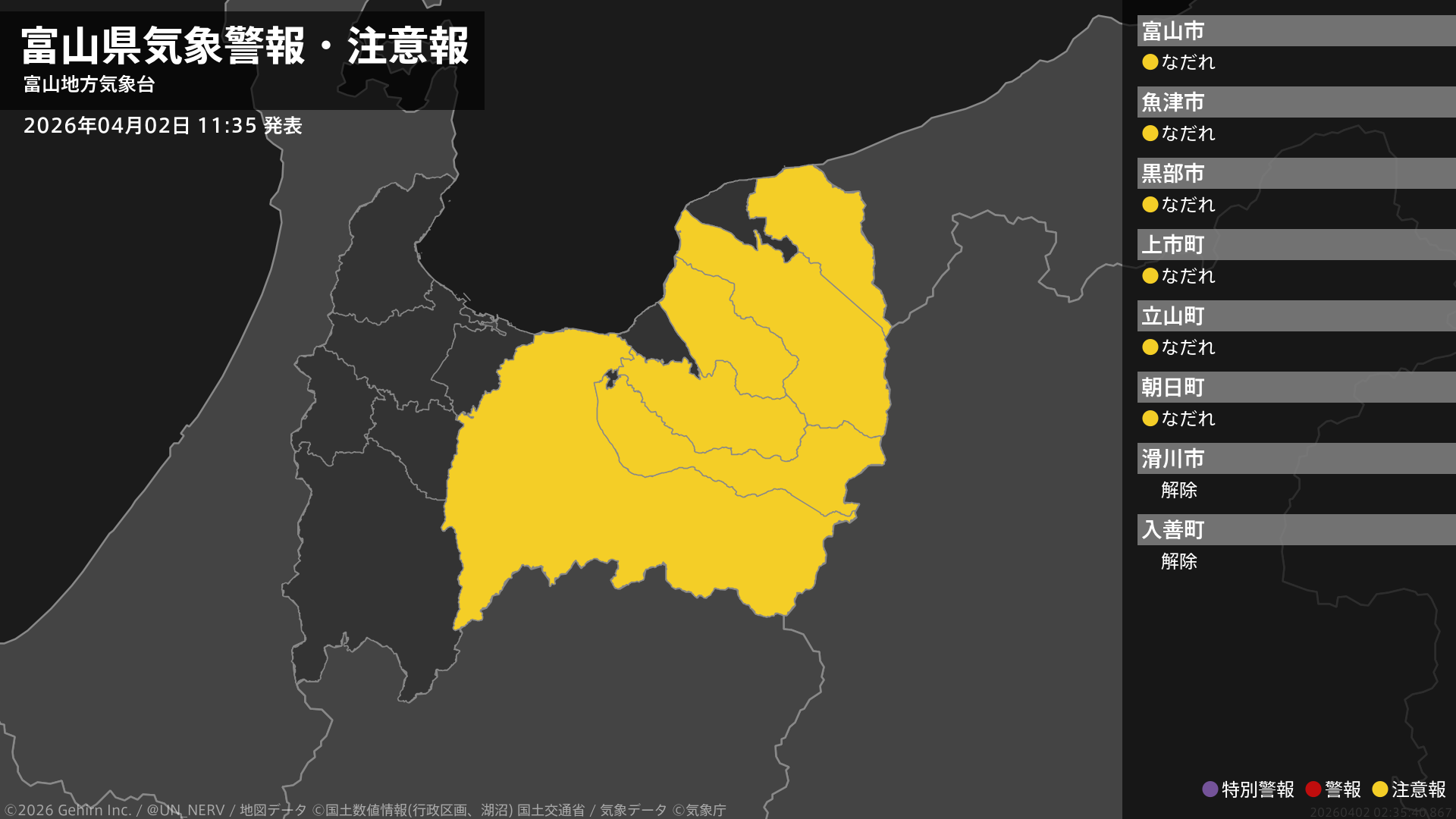 【富山県 気象警報・注意報 2026年04月02日 11:35】東部では、ここしばらくなだれに注意してください。#気象警報注意報 #富山県