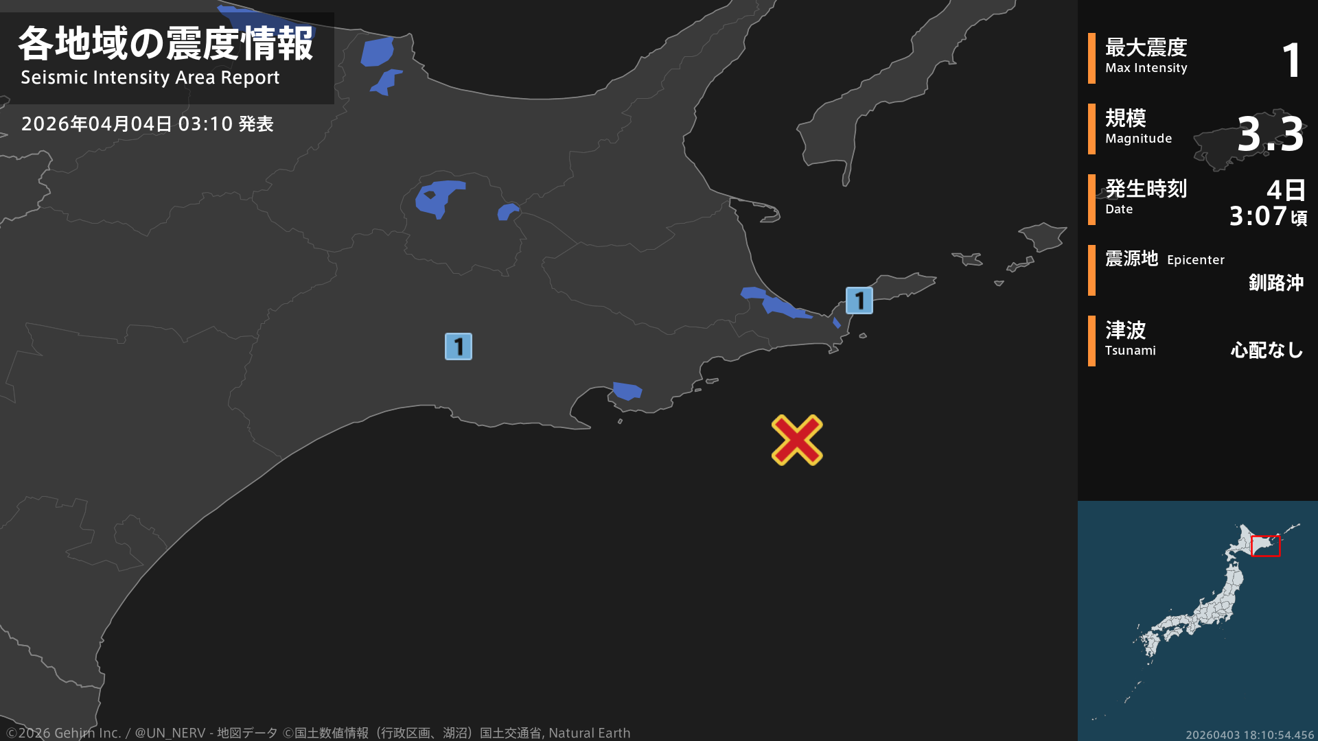 【地震情報 2026年4月4日】3時7分頃、釧路沖を震源とする地震がありました。震源の深さは約40km、地震の規模はM3.3、最大震度1を北海道で観測しています。この地震による津波の心配はありません。#地震 #北海道