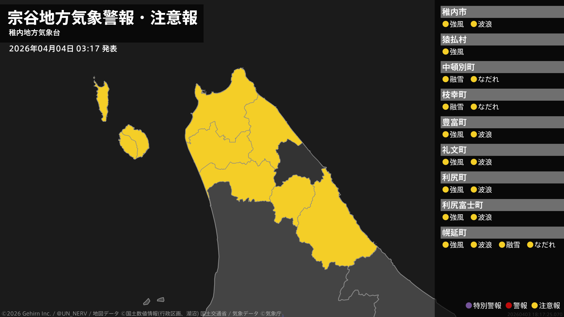 【宗谷地方 気象警報・注意報 2026年04月04日 03:17】宗谷地方では、4日朝から4日夜のはじめ頃まで強風に、4日昼前から4日夜遅くまで高波に、4日昼前から融雪による土砂災害に、5日までなだれに注意してください。#気象警報注意報 #宗谷地方