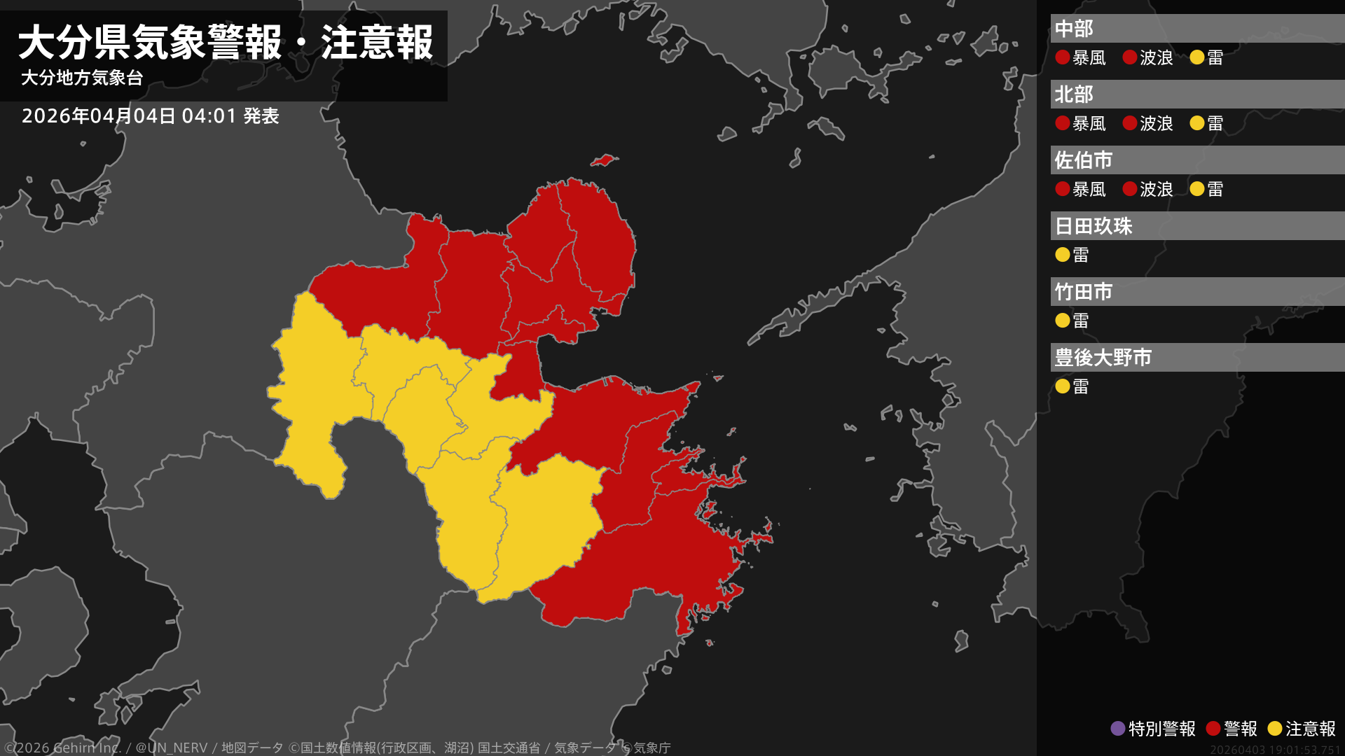 【大分県 気象警報・注意報 2026年04月04日 04:01】大分県の海上では、4日朝から4日昼前まで暴風に警戒してください。北部では4日朝から4日昼前まで、中部、南部では4日朝から4日昼過ぎまで、高波に警戒してください。#気象警報注意報 #大分県