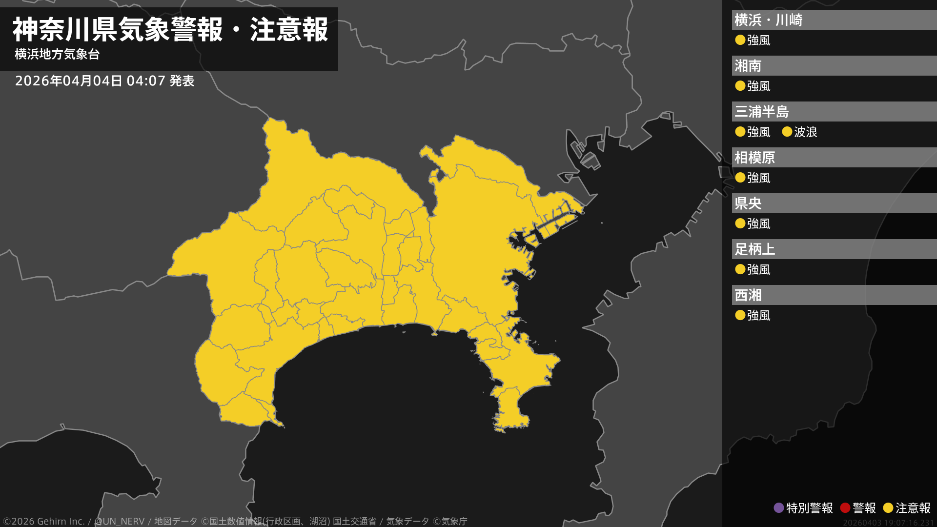 【神奈川県 気象警報・注意報 2026年04月04日 04:07】神奈川県では、4日昼前から5日明け方まで強風に注意してください。東部では、4日昼前から高波に注意してください。#気象警報注意報 #神奈川県
