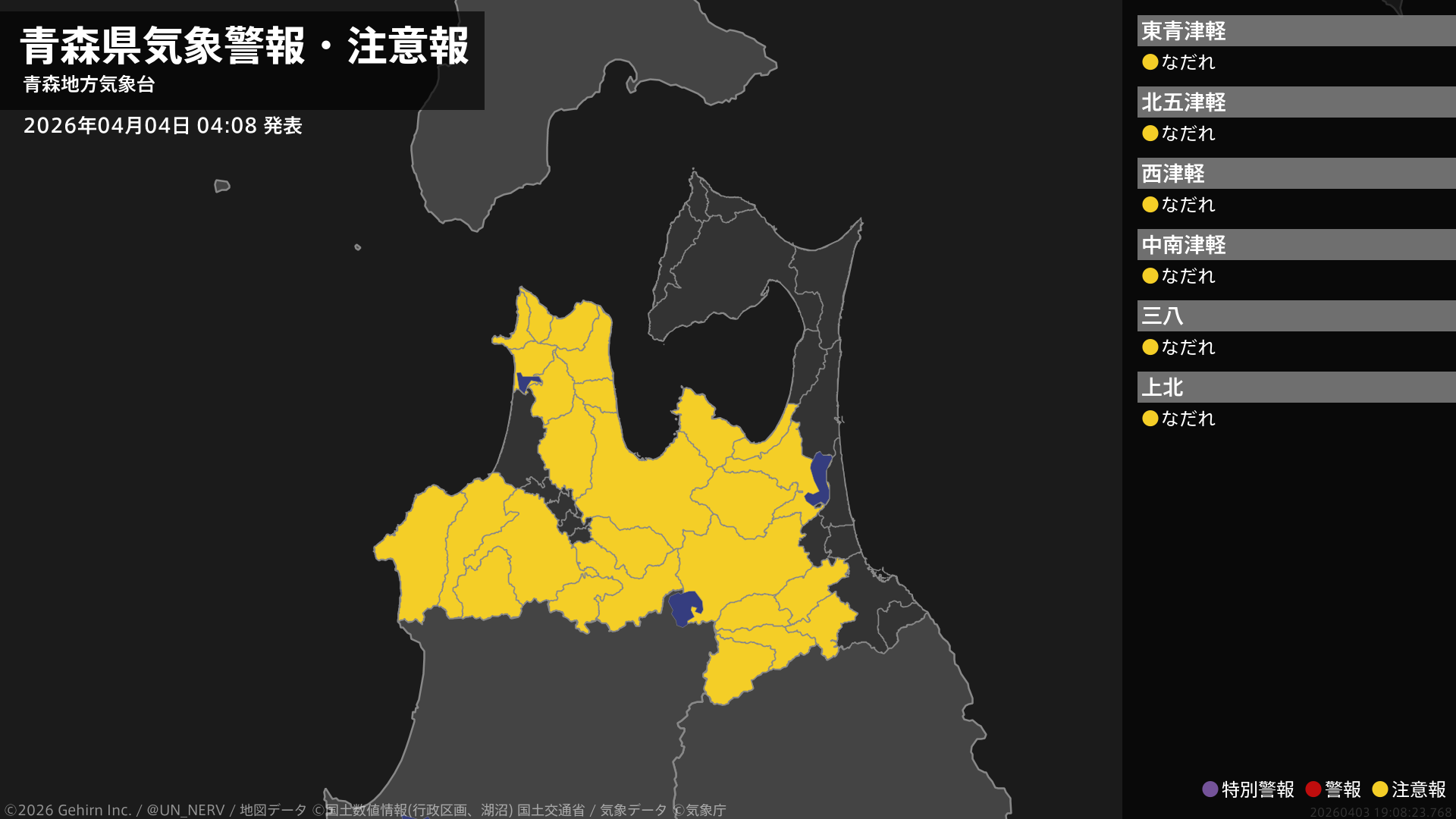 【青森県 気象警報・注意報 2026年04月04日 04:08】津軽、三八上北では、ここしばらくなだれに注意してください。#気象警報注意報 #青森県
