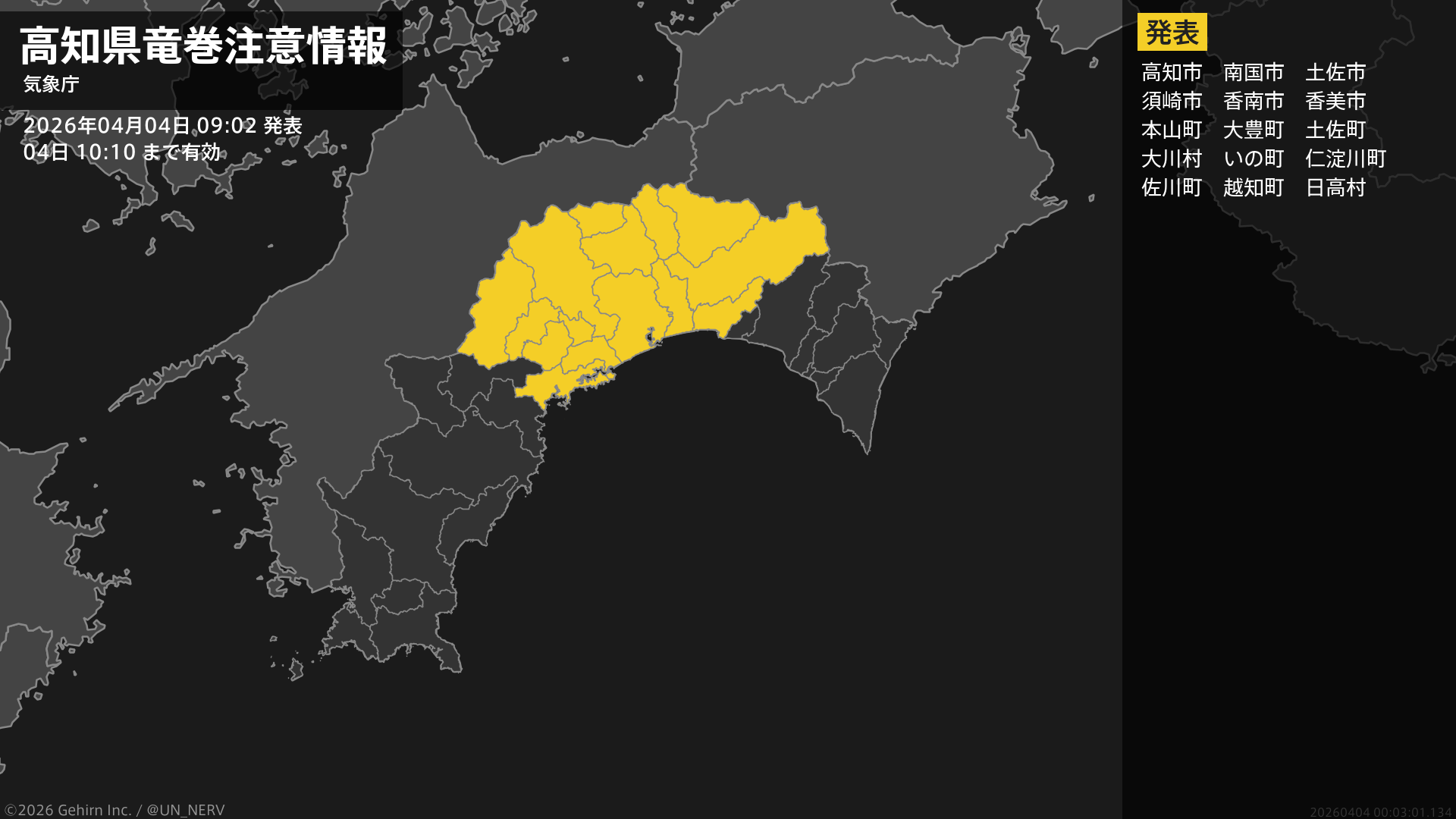 【高知県 竜巻注意情報】高知県は、竜巻などの激しい突風が発生しやすい気象状況になっています。頑丈な建物内に移動するなど安全確保に努めてください。この情報は04日10:10まで有効です。#竜巻注意情報 #高知県