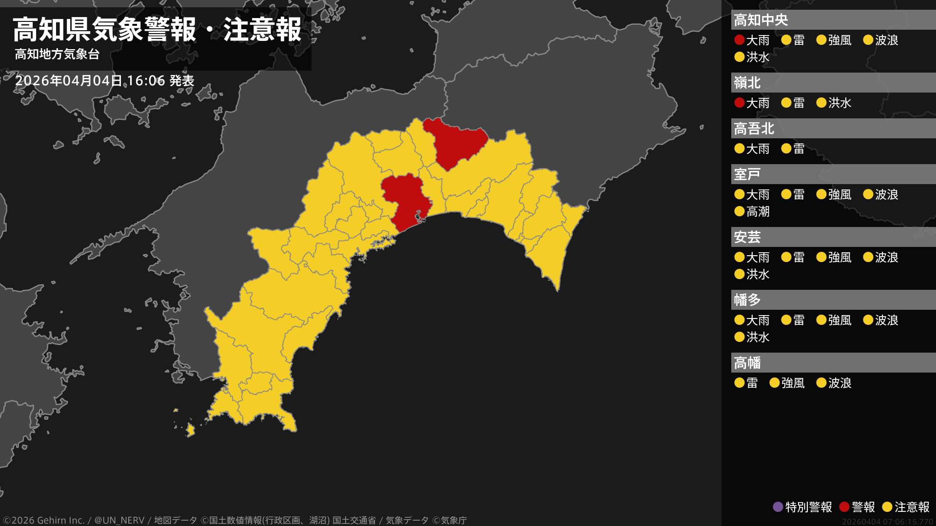 【高知県 気象警報・注意報 2026年04月04日 16:06】中部では、4日夜のはじめ頃まで低い土地の浸水に警戒してください。#気象警報注意報 #高知県