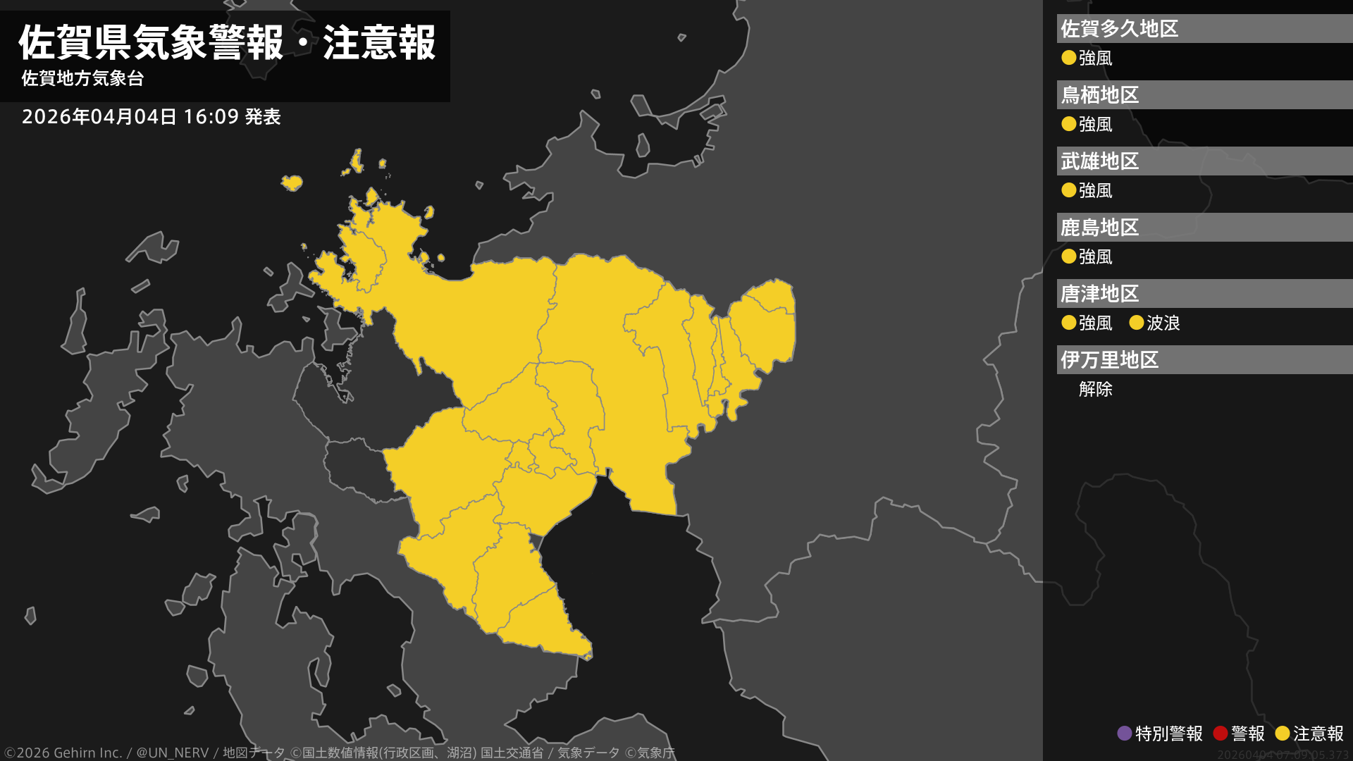 【佐賀県 気象警報・注意報 2026年04月04日 16:09】佐賀県では、強風に注意してください。北部では、高波に注意してください。#気象警報注意報 #佐賀県