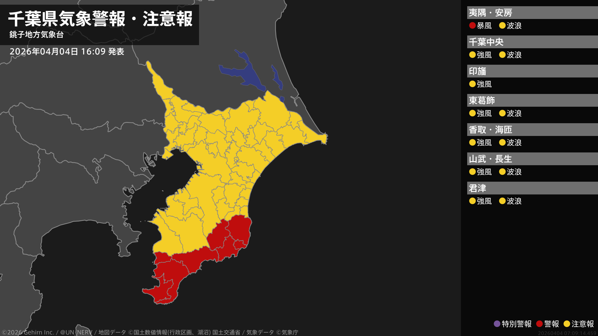 【千葉県 気象警報・注意報 2026年04月04日 16:09】南部では、4日夜遅くから5日未明まで暴風に警戒してください。#気象警報注意報 #千葉県