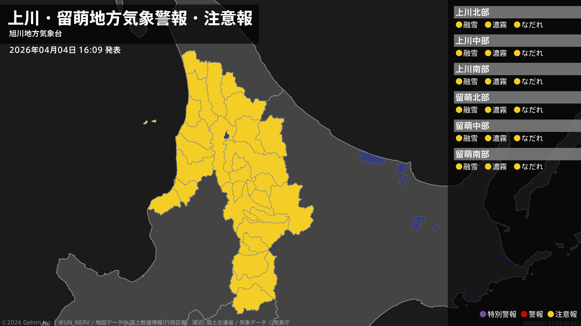 【上川・留萌地方 気象警報・注意報 2026年04月04日 16:09】上川、留萌地方では、融雪による土砂災害や濃霧による視程障害、なだれに注意してください。#気象警報注意報 #上川地方 #留萌地方
