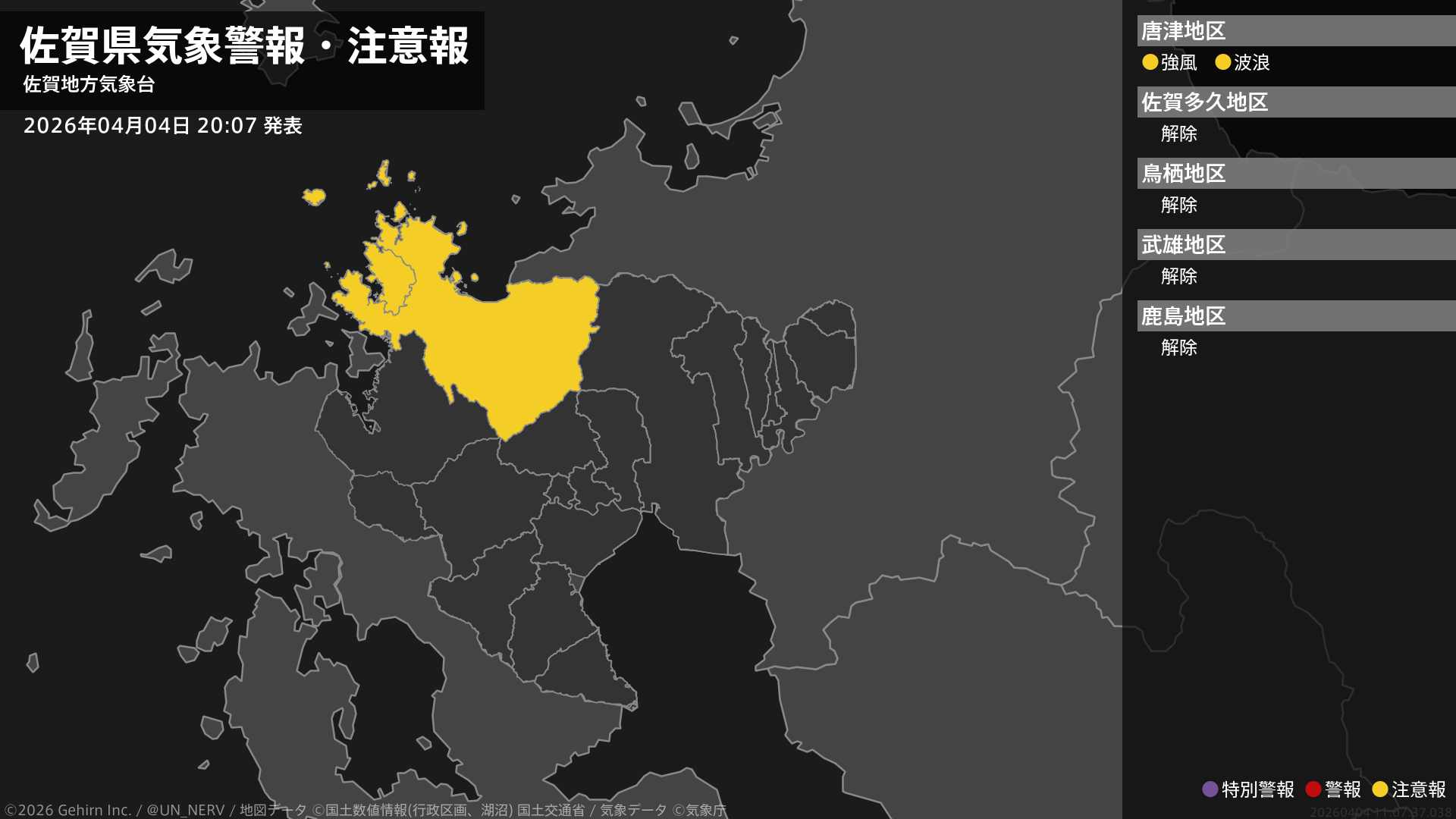 【佐賀県 気象警報・注意報 2026年04月04日 20:07】北部では、5日夜のはじめ頃まで強風に、4日夜遅くまで高波に注意してください。#気象警報注意報 #佐賀県