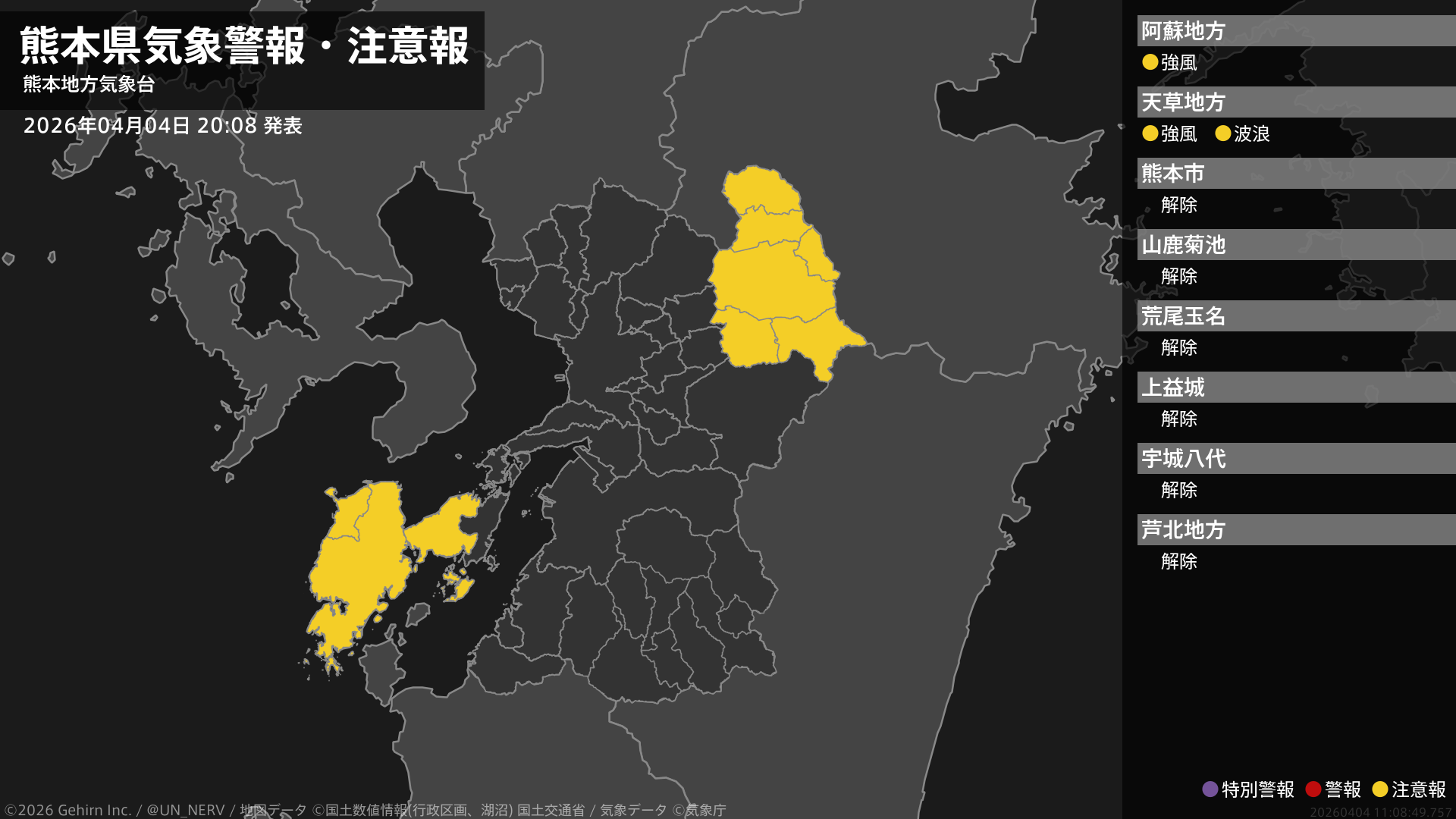 【熊本県 気象警報・注意報 2026年04月04日 20:08】阿蘇、天草・芦北地方では、4日夜遅くまで強風に注意してください。天草・芦北地方では、4日夜遅くまで高波に注意してください。#気象警報注意報 #熊本県