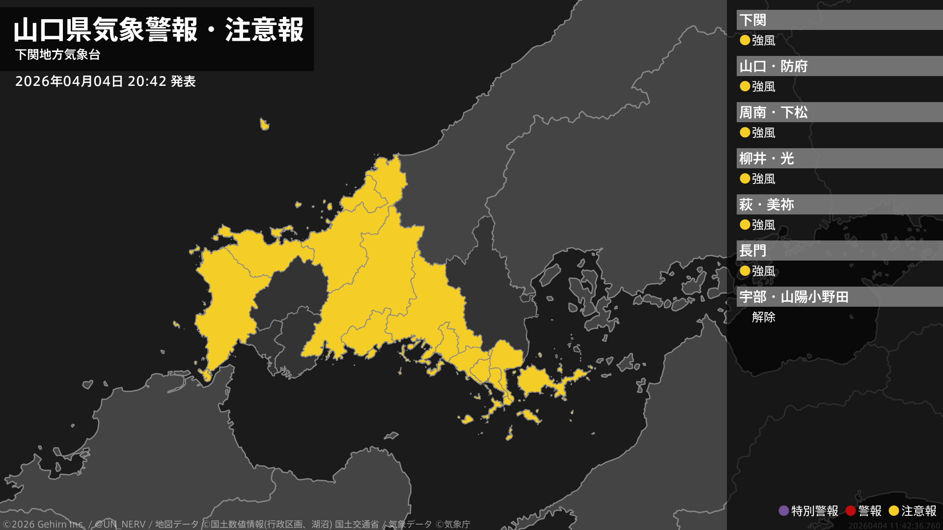 【山口県 気象警報・注意報 2026年04月04日 20:42】山口県では、強風に注意してください。#気象警報注意報 #山口県
