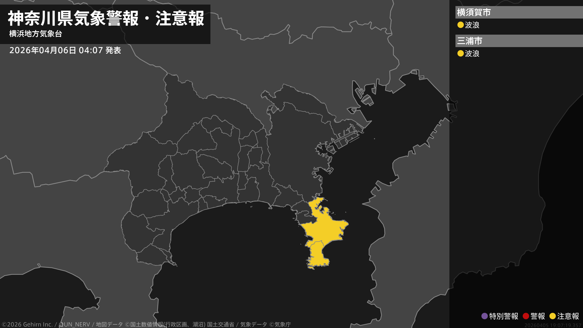 【神奈川県 気象警報・注意報 2026年04月06日 04:07】東部では、6日夜のはじめ頃まで高波に注意してください。#気象警報注意報 #神奈川県