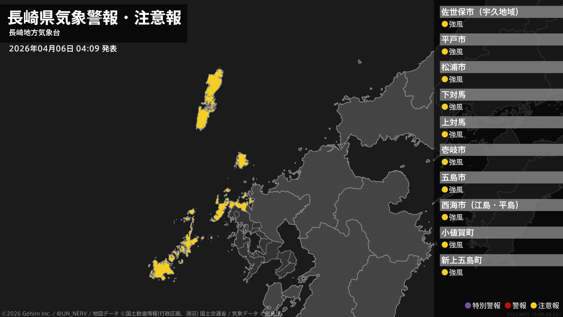 【長崎県 気象警報・注意報 2026年04月06日 04:09】北部、壱岐・対馬、五島では、強風に注意してください。#気象警報注意報 #長崎県