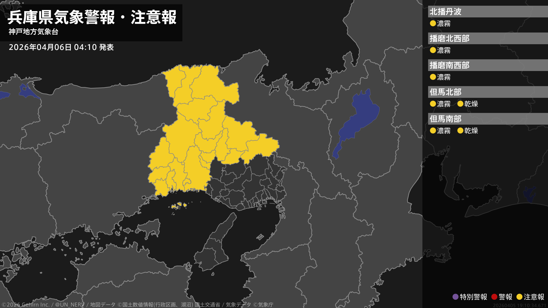 【兵庫県 気象警報・注意報 2026年04月06日 04:10】兵庫県では、6日昼前まで濃霧による視程障害に注意してください。北部では、6日まで空気の乾燥した状態が続くため、火の取り扱いに注意してください。#気象警報注意報 #兵庫県