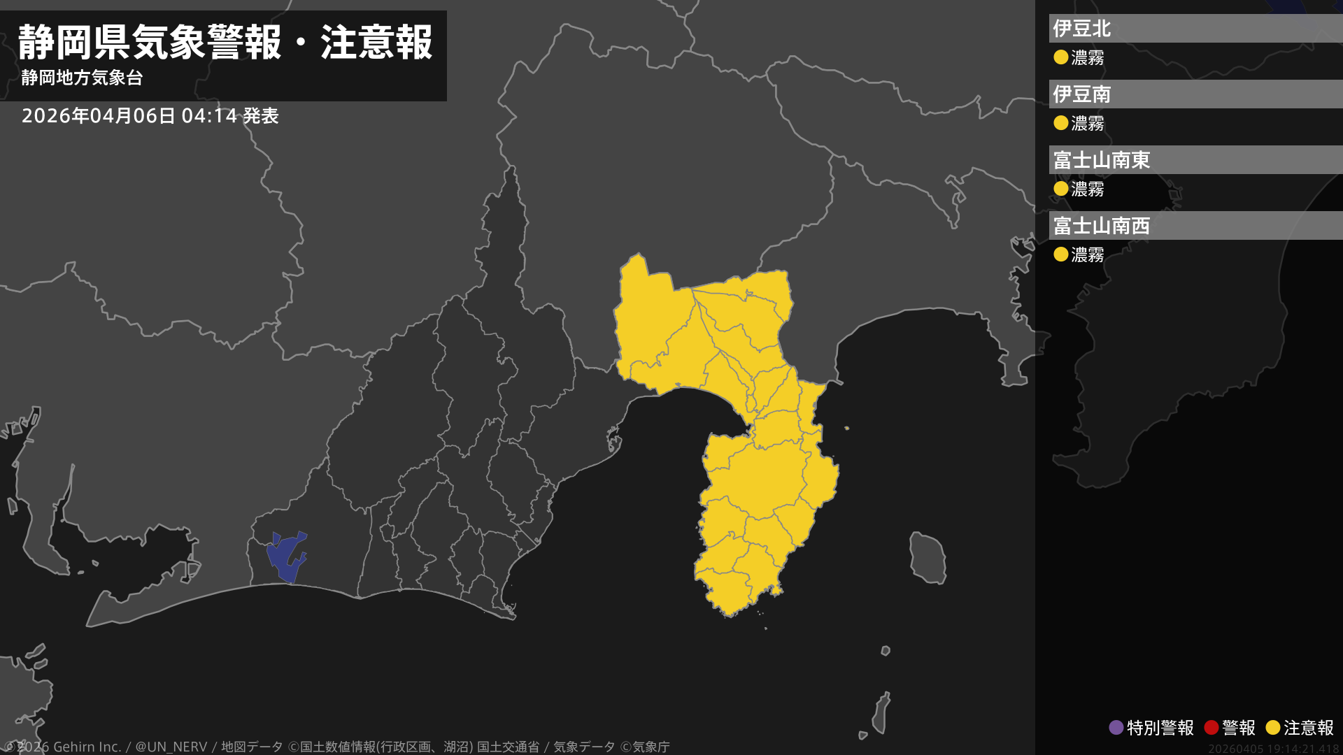 【静岡県 気象警報・注意報 2026年04月06日 04:14】伊豆、東部では、6日昼前まで濃霧による視程障害に注意してください。#気象警報注意報 #静岡県