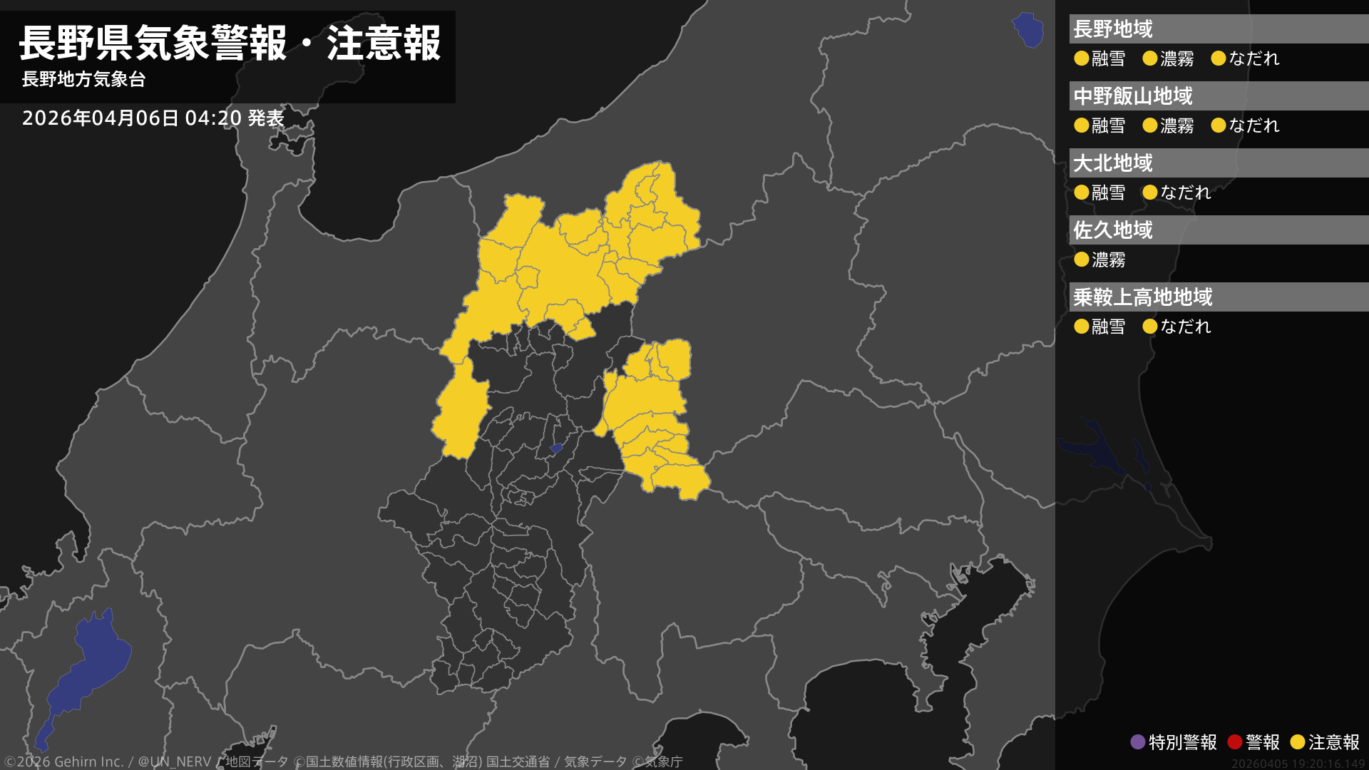 【長野県 気象警報・注意報 2026年04月06日 04:20】北部、中部では、6日夜遅くまで融雪による土砂災害に、6日昼前まで濃霧による視程障害に、7日までなだれに注意してください。#気象警報注意報 #長野県