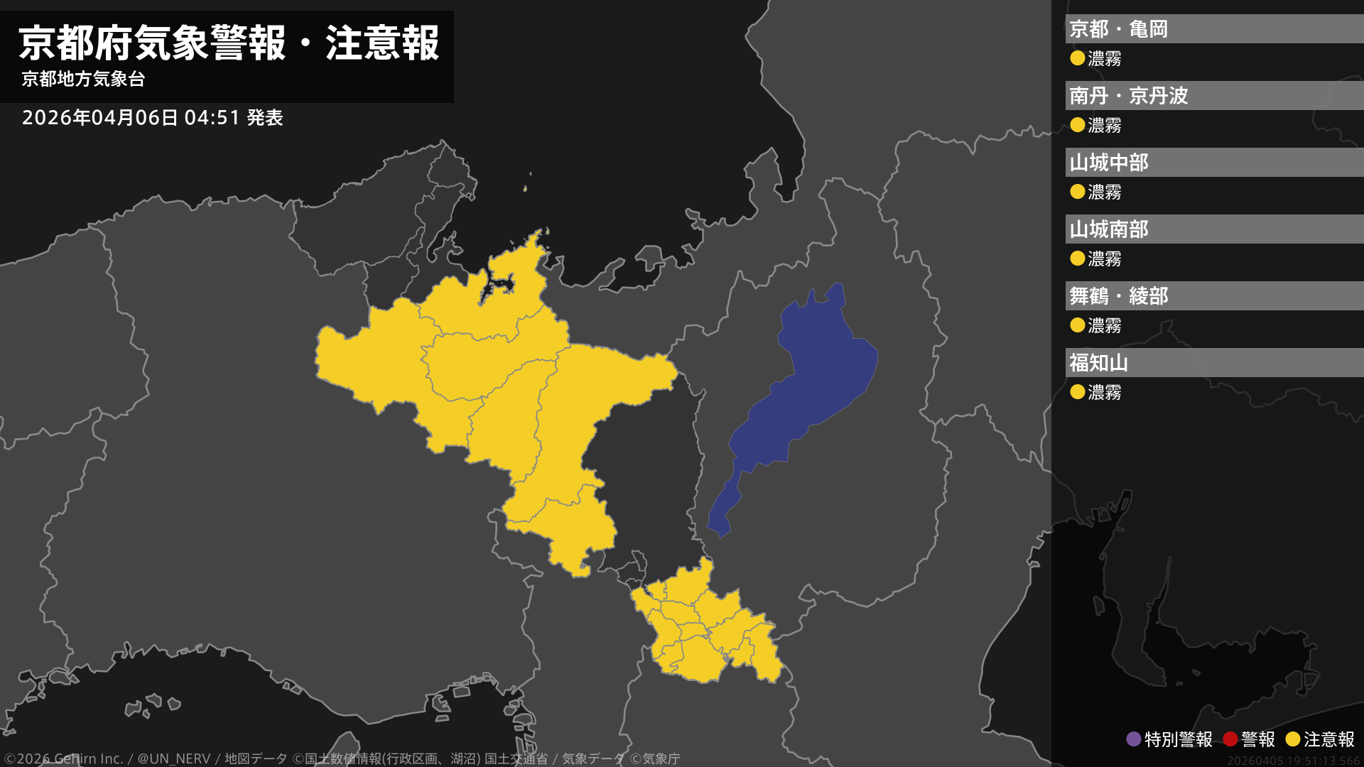 【京都府 気象警報・注意報 2026年04月06日 04:51】京都府では、6日昼前まで濃霧による視程障害に注意してください。#気象警報注意報 #京都府