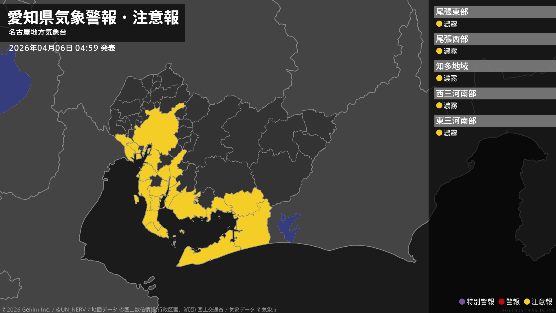 【愛知県 気象警報・注意報 2026年04月06日 04:59】愛知県では、6日昼前まで濃霧による視程障害に注意してください。#気象警報注意報 #愛知県
