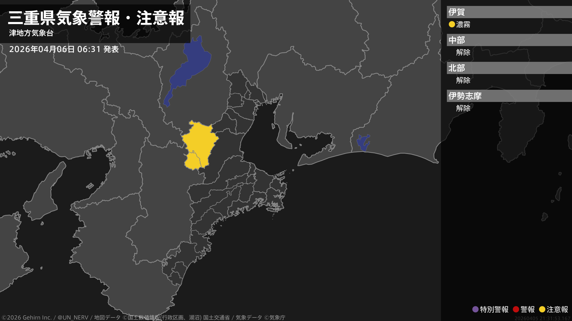 【三重県 気象警報・注意報 2026年04月06日 06:31】北中部では、6日昼前まで濃霧による視程障害に注意してください。#気象警報注意報 #三重県