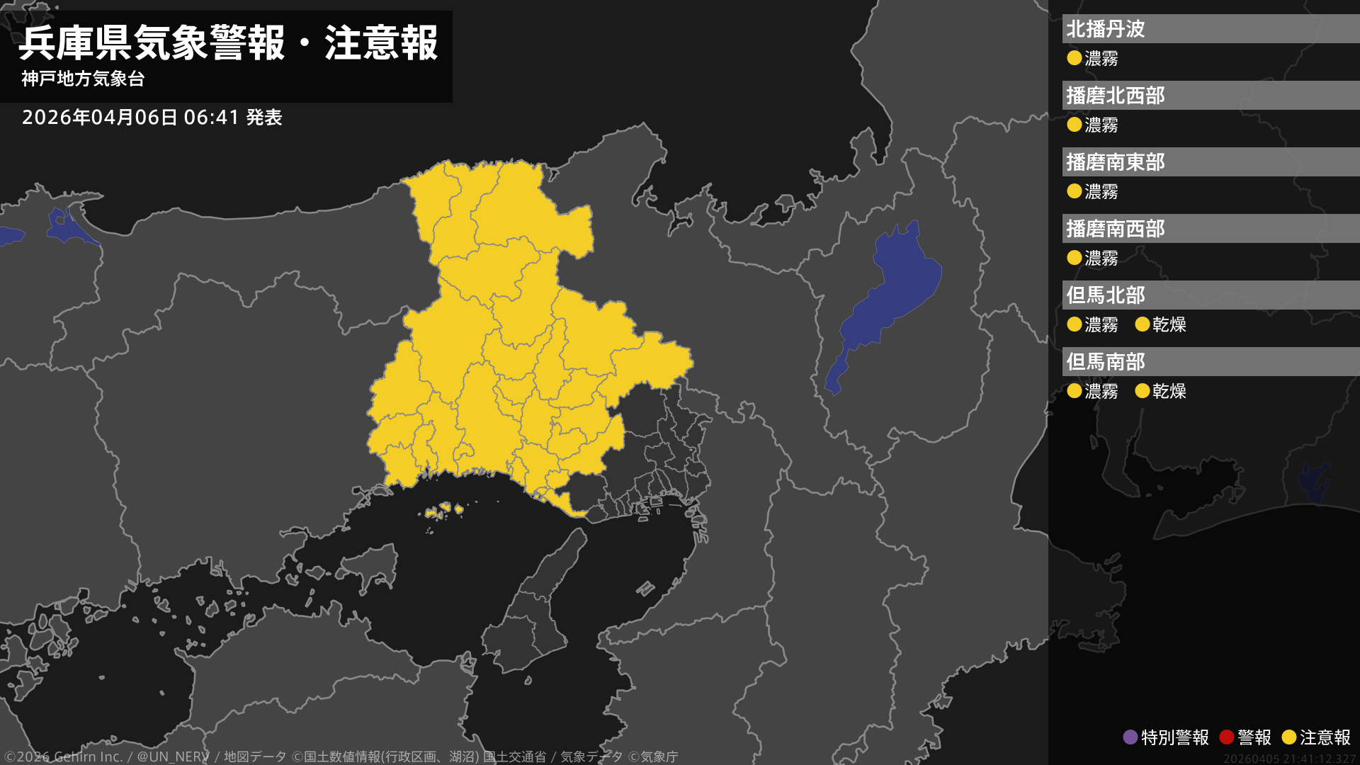 【兵庫県 気象警報・注意報 2026年04月06日 06:41】兵庫県では、6日昼前まで濃霧による視程障害に注意してください。北部では、6日まで空気の乾燥した状態が続くため、火の取り扱いに注意してください。#気象警報注意報 #兵庫県
