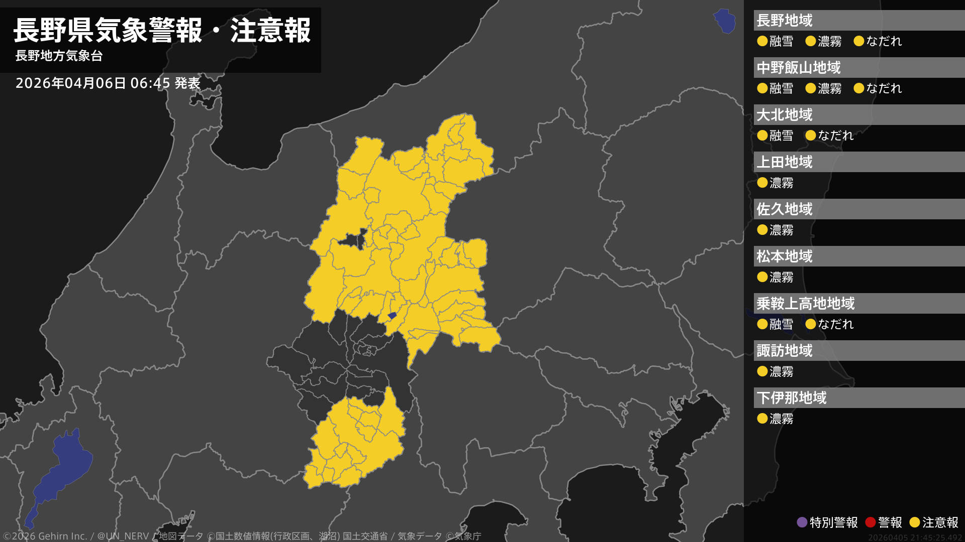 【長野県 気象警報・注意報 2026年04月06日 06:45】北部、中部では、6日夜遅くまで融雪による土砂災害に、7日までなだれに注意してください。長野県では、6日昼前まで濃霧による視程障害に注意してください。#気象警報注意報 #長野県