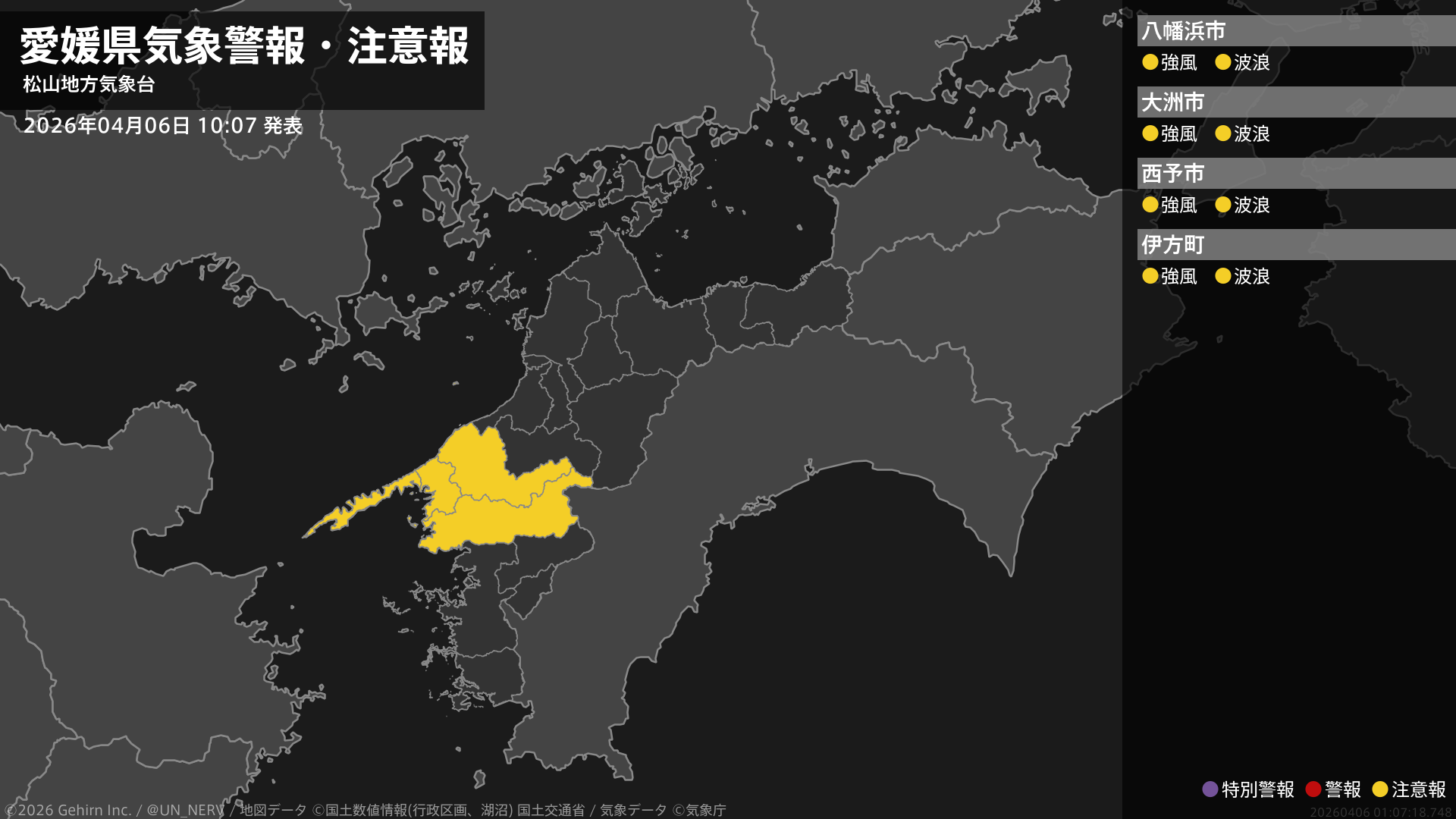 【愛媛県 気象警報・注意報 2026年04月06日 10:07】南予では、6日夕方から強風や高波に注意してください。#気象警報注意報 #愛媛県