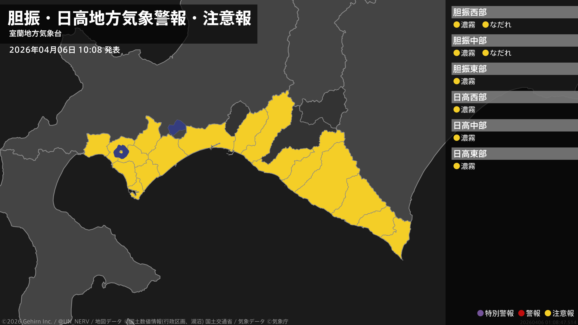 【胆振・日高地方 気象警報・注意報 2026年04月06日 10:08】胆振、日高地方では、7日昼前まで濃霧による視程障害に注意してください。胆振地方では、7日までなだれに注意してください。#気象警報注意報 #胆振地方 #日高地方