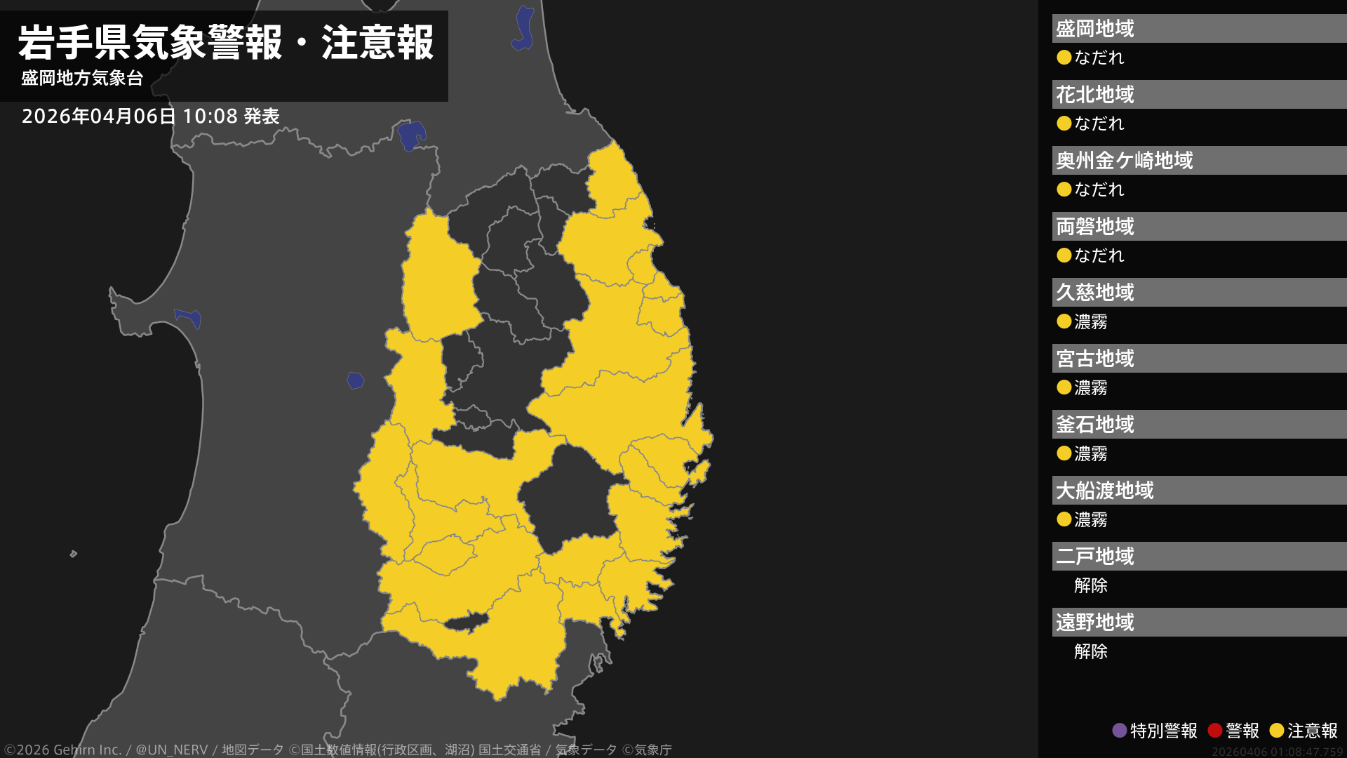 【岩手県 気象警報・注意報 2026年04月06日 10:08】沿岸北部、沿岸南部では、7日昼前まで濃霧による視程障害に注意してください。内陸では、ここしばらくなだれに注意してください。#気象警報注意報 #岩手県