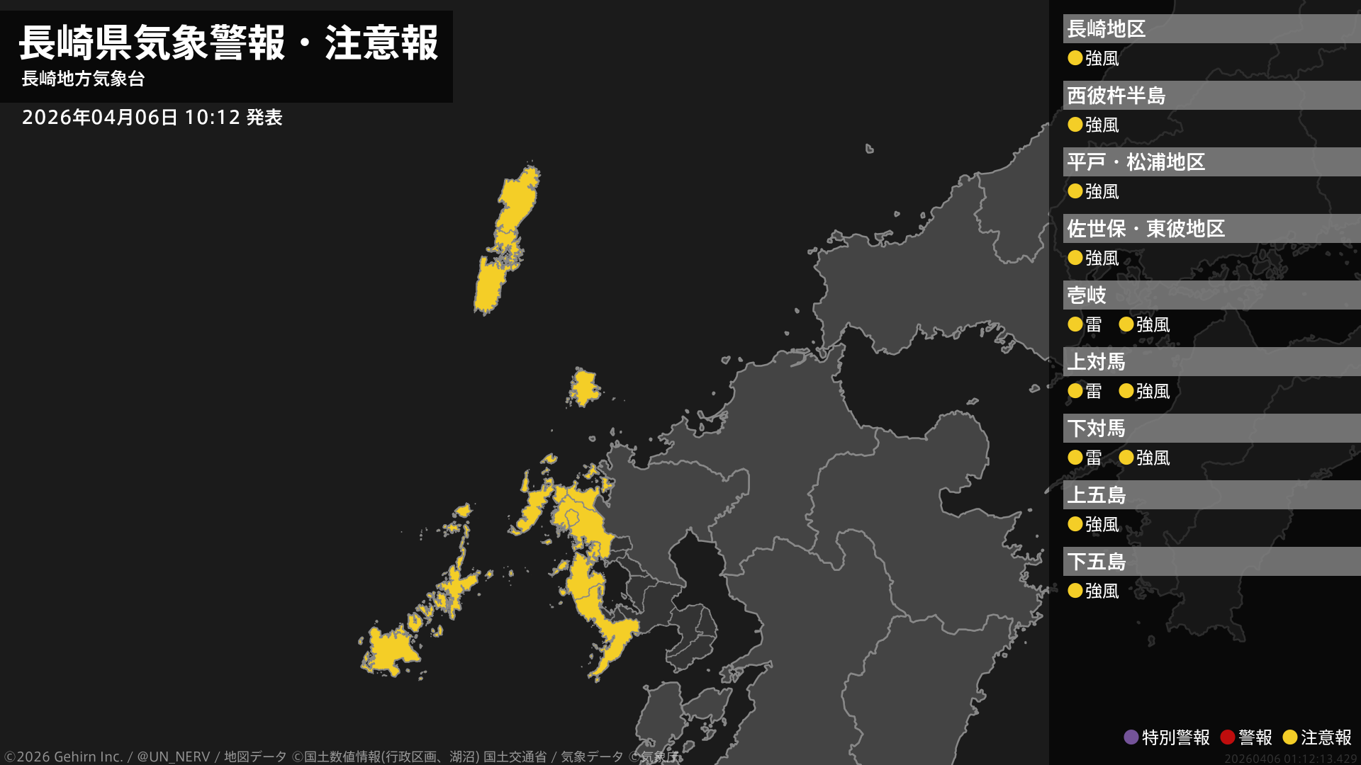 【長崎県 気象警報・注意報 2026年04月06日 10:12】長崎県では、強風に注意してください。壱岐・対馬では、急な強い雨や落雷に注意してください。#気象警報注意報 #長崎県