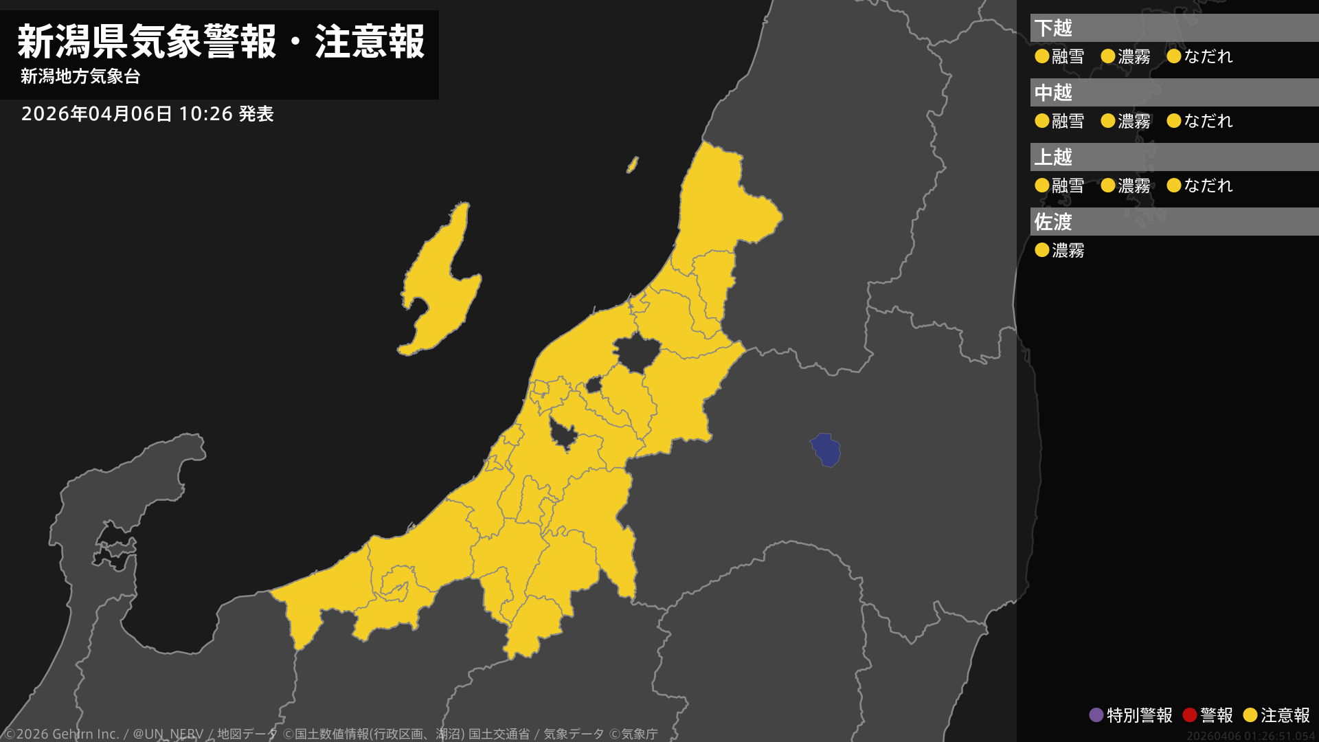 【新潟県 気象警報・注意報 2026年04月06日 10:26】下越、中越、上越では、融雪による土砂災害やなだれに注意してください。新潟県では、濃霧による視程障害に注意してください。#気象警報注意報 #新潟県