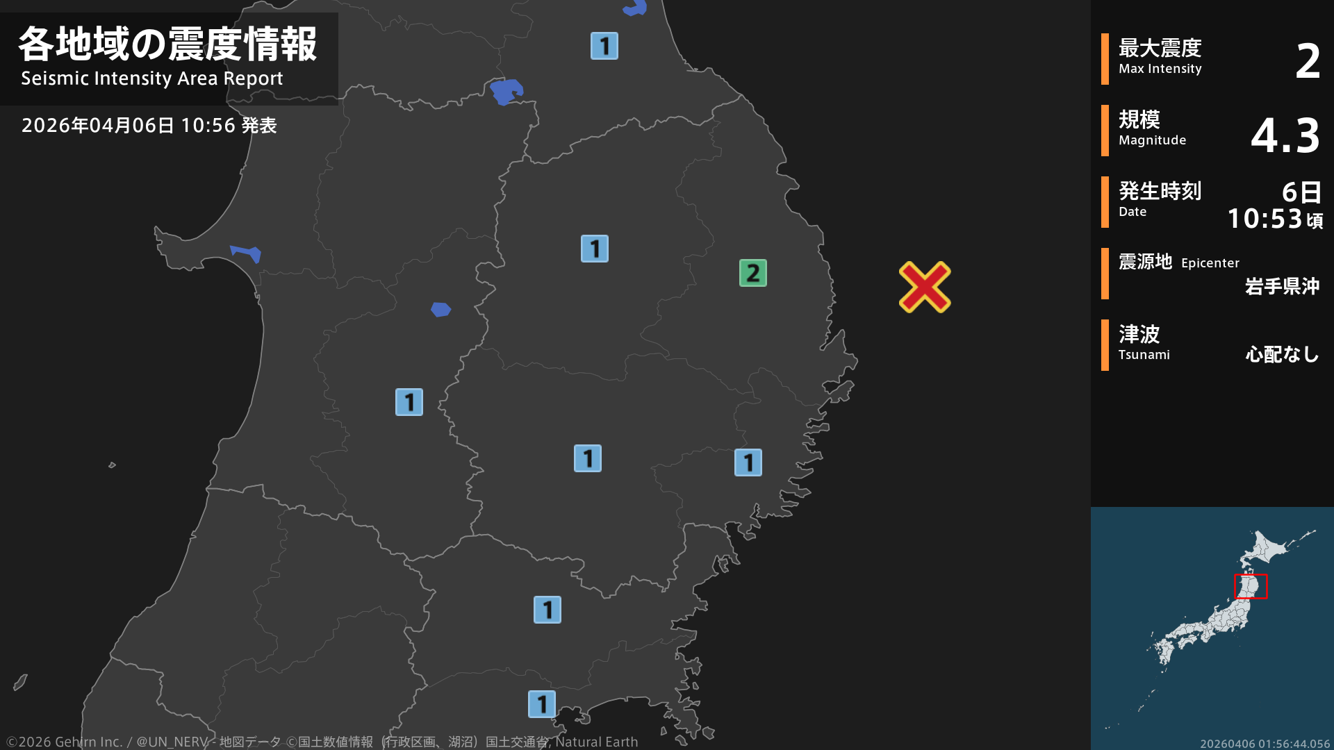 【地震情報 2026年4月6日】10時53分頃、岩手県沖を震源とする地震がありました。震源の深さは約10km、地震の規模はM4.3、最大震度2を岩手県で観測しています。この地震による津波の心配はありません。#地震 #岩手県 #青森県 #宮城県 #秋田県