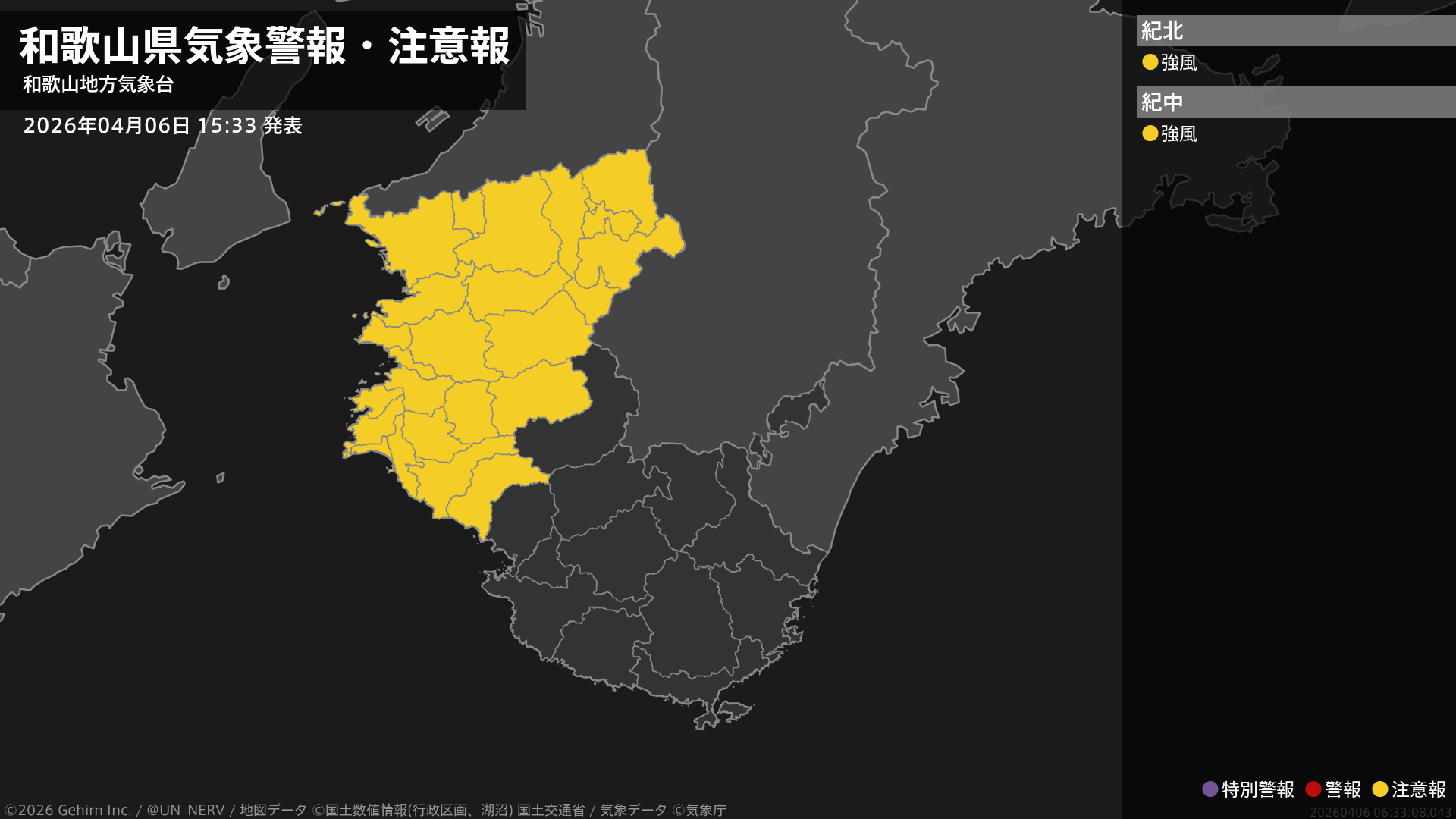 【和歌山県 気象警報・注意報 2026年04月06日 15:33】北部では、6日夜遅くから強風に注意してください。#気象警報注意報 #和歌山県