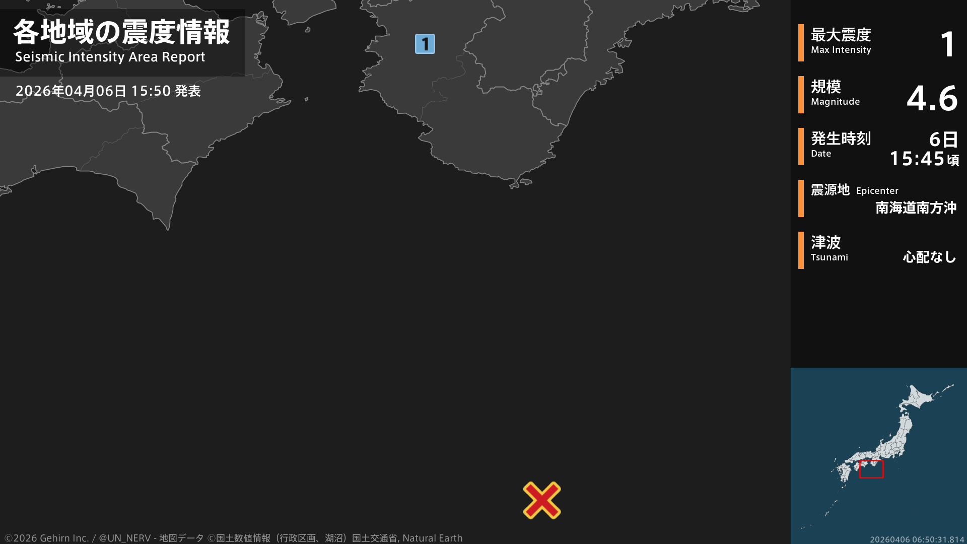 【地震情報 2026年4月6日】15時45分頃、南海道南方沖を震源とする地震がありました。震源の深さは約10km、地震の規模はM4.6、最大震度1を和歌山県で観測しています。この地震による津波の心配はありません。#地震 #和歌山県