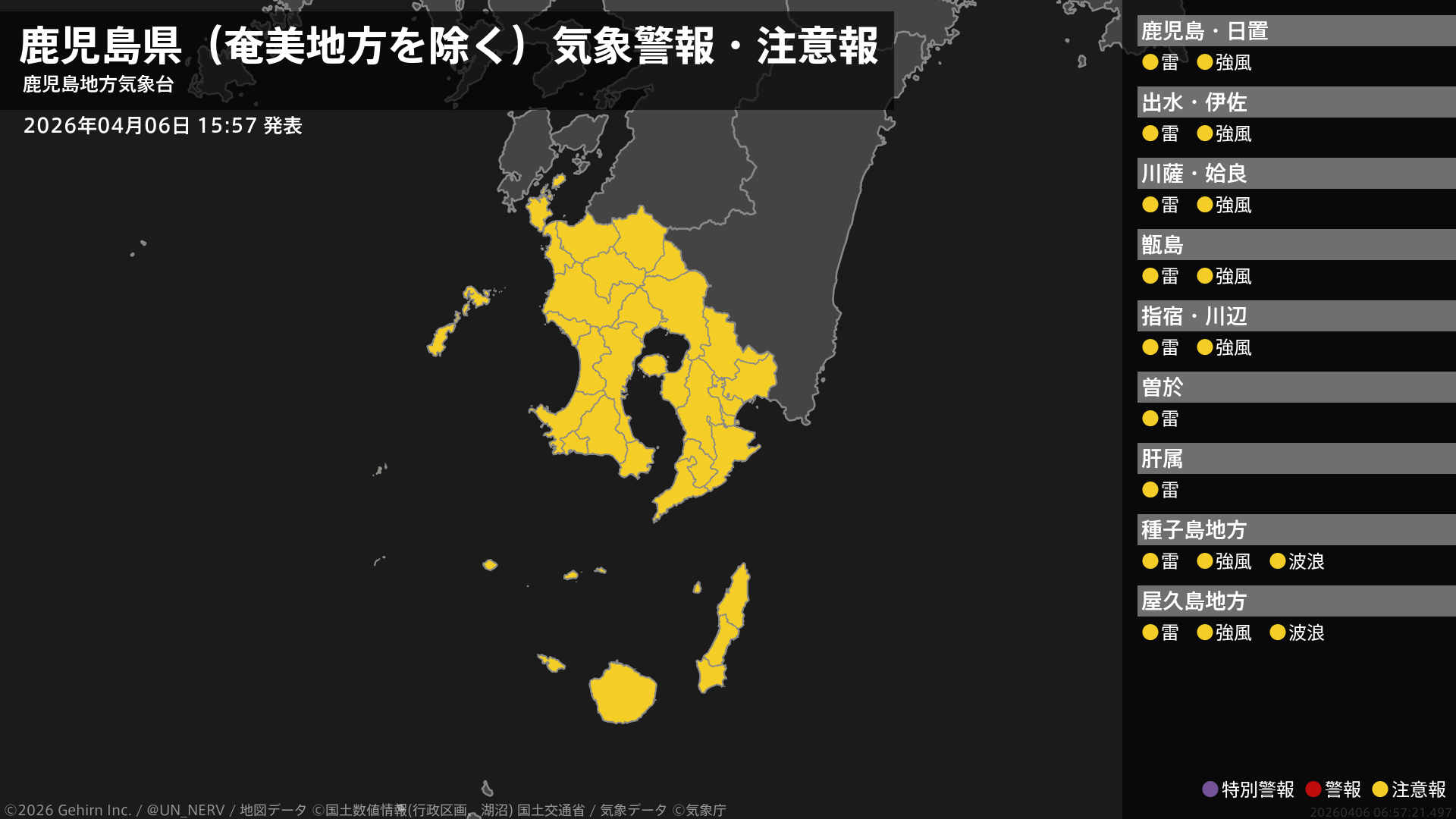【鹿児島県(奄美地方を除く) 気象警報・注意報 2026年04月06日 15:57】薩摩、種子島・屋久島地方では強風に、種子島・屋久島地方では高波に、薩摩、大隅、種子島・屋久島地方では竜巻などの激しい突風や急な強い雨、落雷に注意してください。#気象警報注意報 #鹿児島県(奄美地方除く)