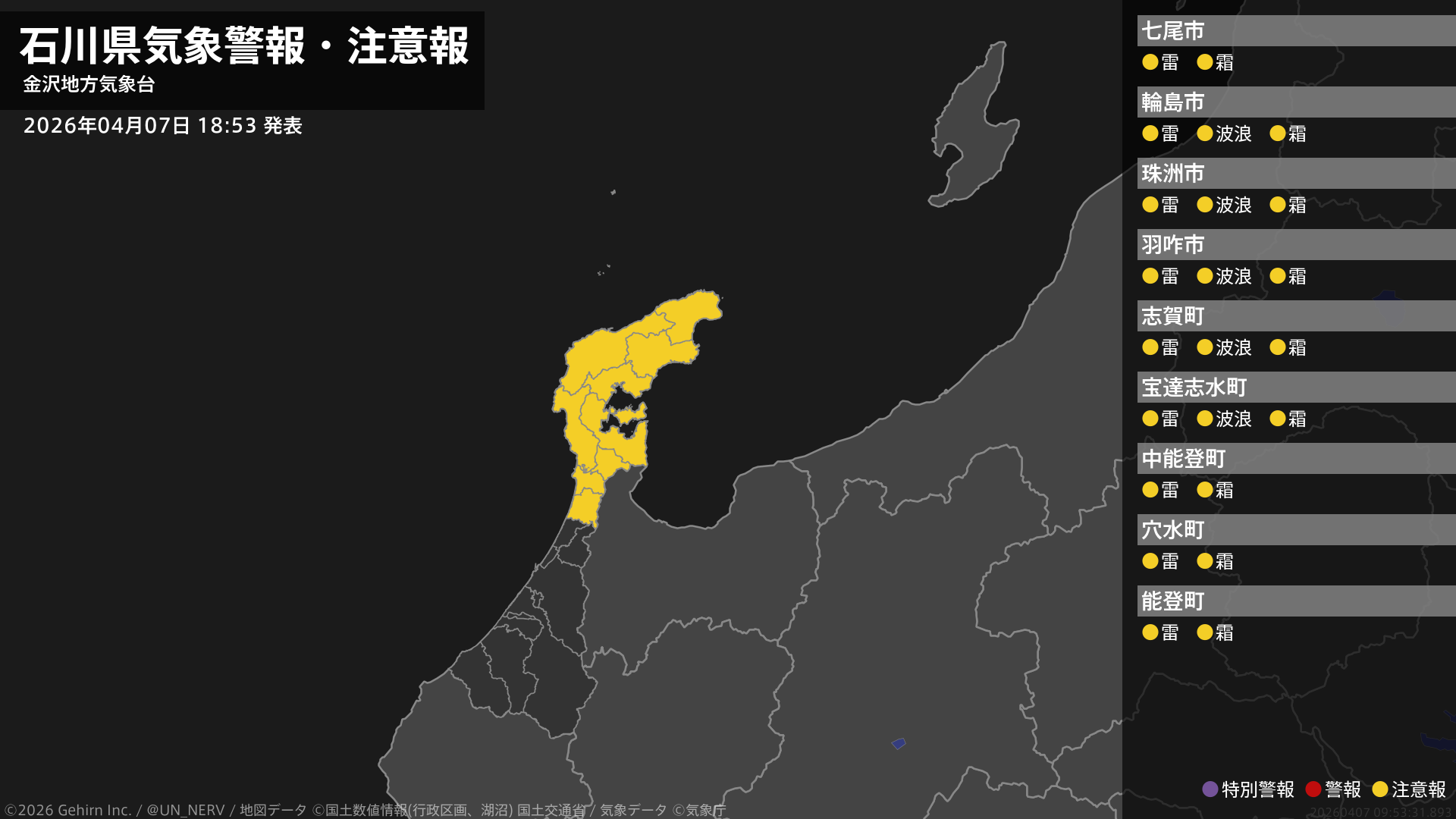 【石川県 気象警報・注意報 2026年04月07日 18:53】
