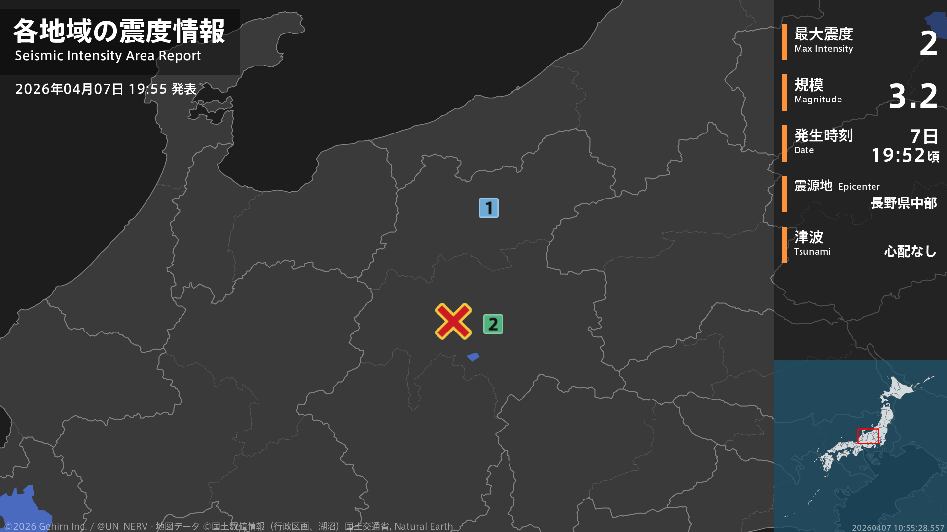 19時52分頃、長野県中部を震源とする地震がありました。震源の深さは約10km、地震の規模はM3.2、最大震度2を長野県で観測しています。この地震による津波の心配はありません。