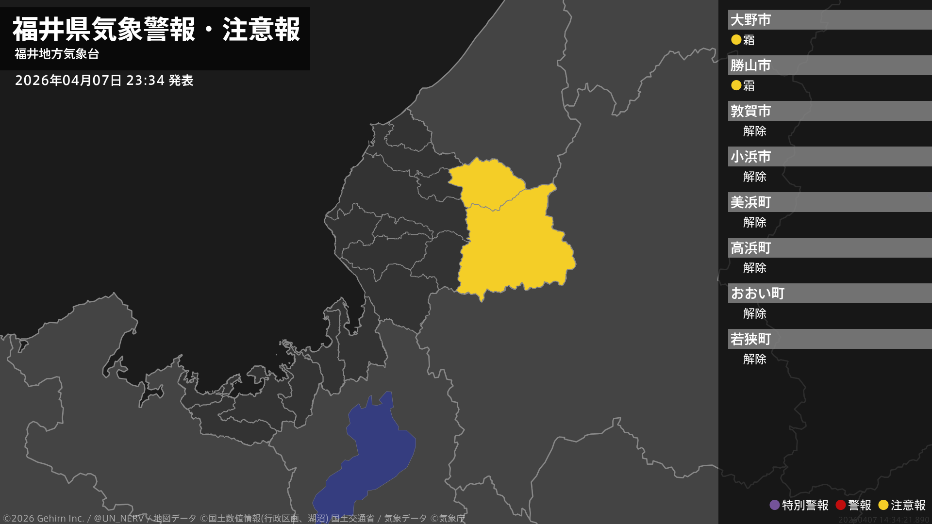 【福井県 気象警報・注意報 2026年04月07日 23:34】