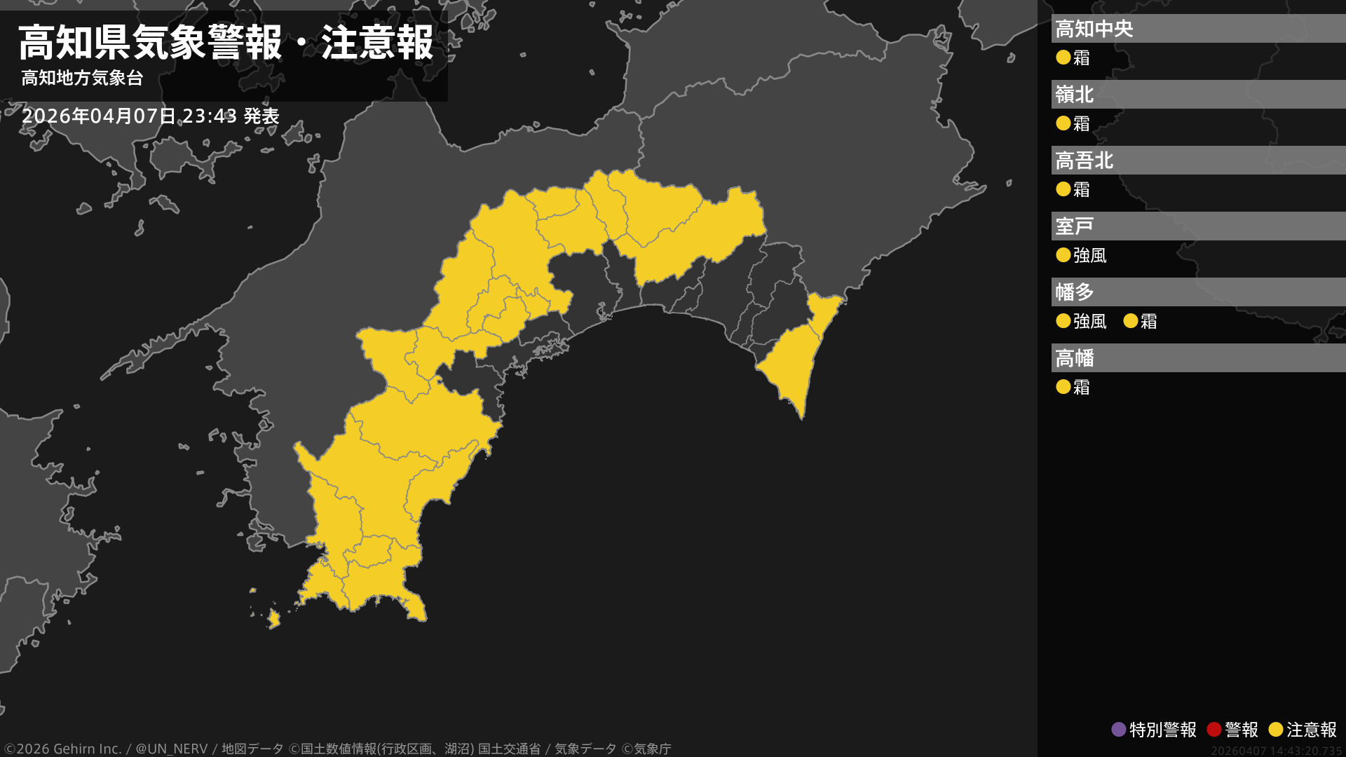 【高知県 気象警報・注意報 2026年04月07日 23:43】