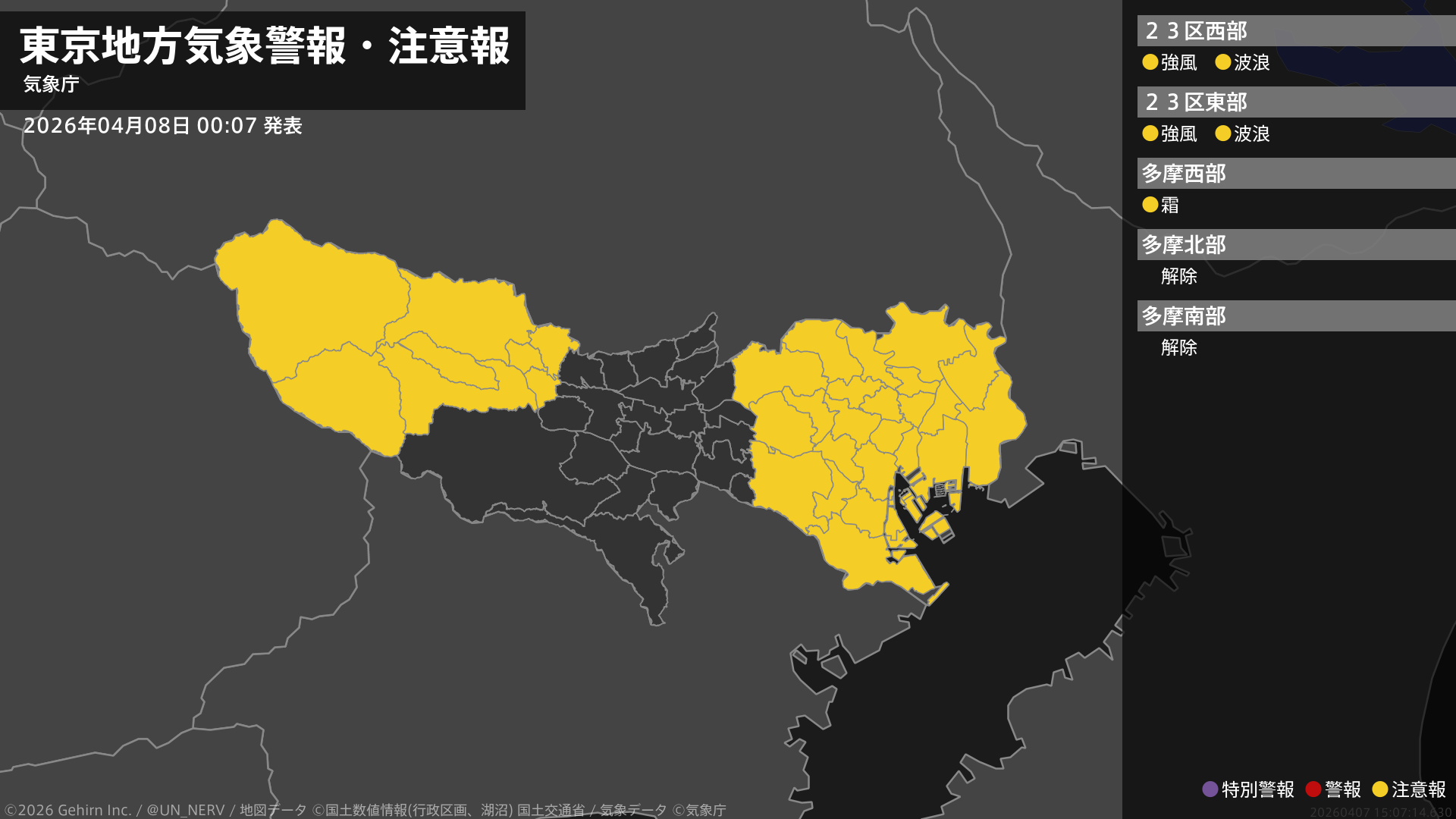 【東京都 気象警報・注意報 2026年04月08日 00:07】