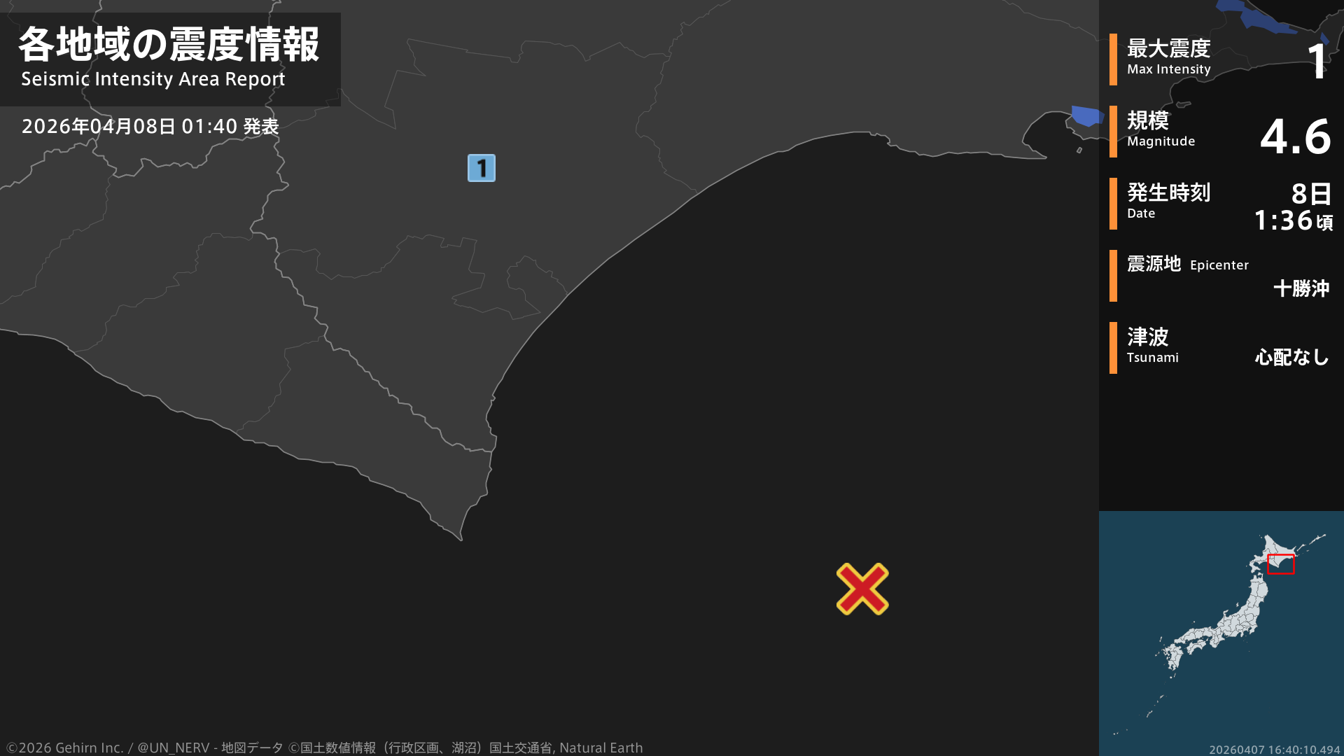 1時36分頃、十勝沖を震源とする地震がありました。震源の深さは約20km、地震の規模はM4.6、最大震度1を北海道で観測しています。この地震による津波の心配はありません。
