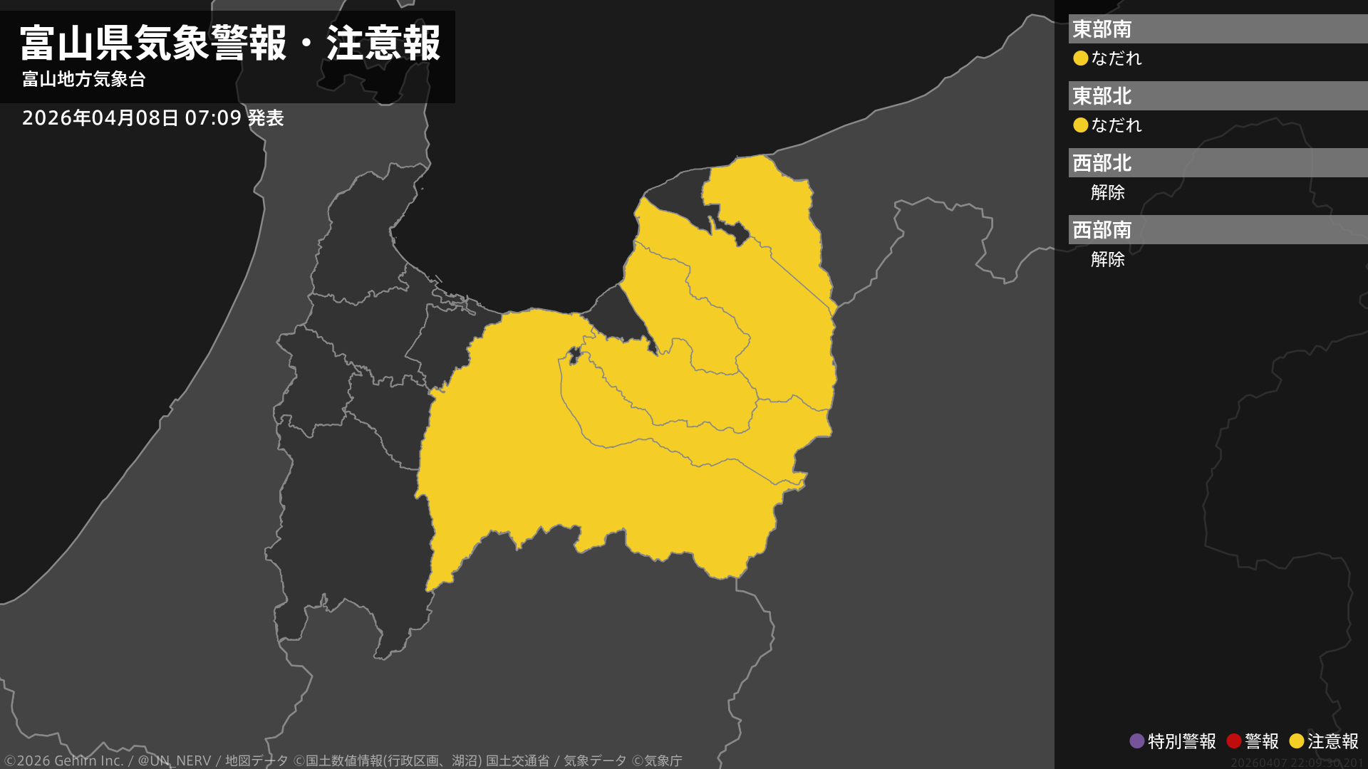 【富山県 気象警報・注意報 2026年04月08日 07:09】