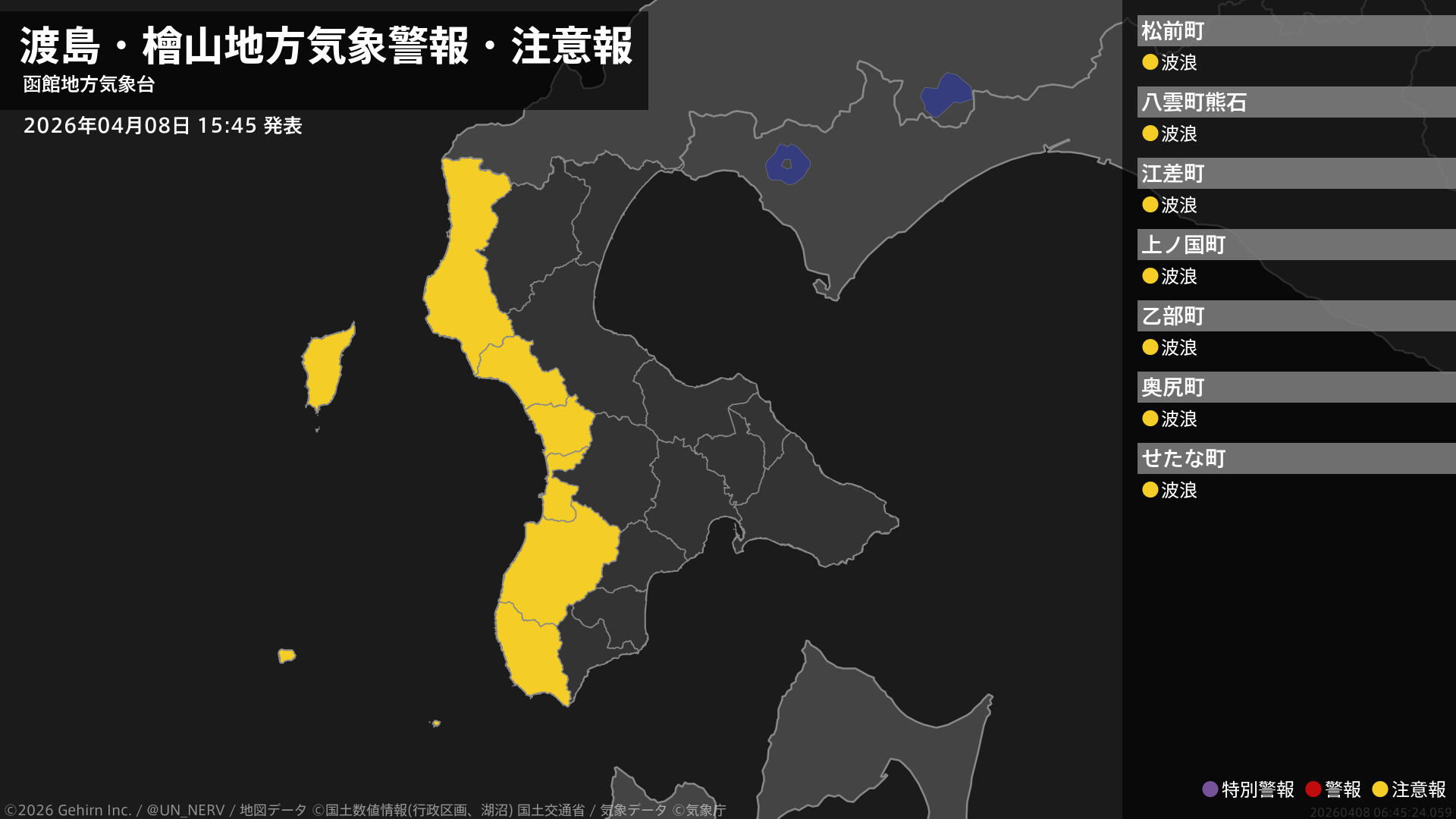 【渡島・檜山地方 気象警報・注意報 2026年04月08日 15:45】