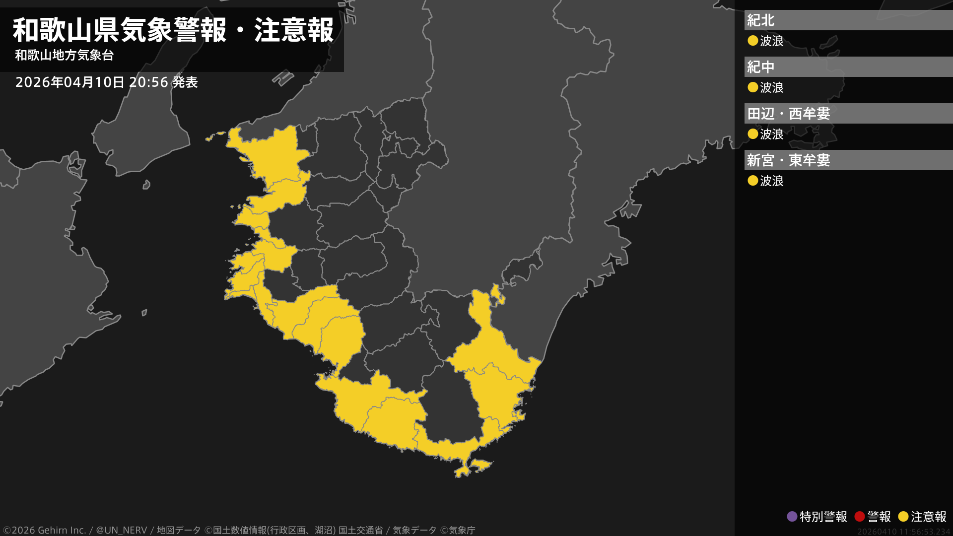 【和歌山県 気象警報・注意報 2026年04月10日 20:56】北部では10日夜遅くまで、南部では11日明け方まで、高波に注意してください。#気象警報注意報 #和歌山県