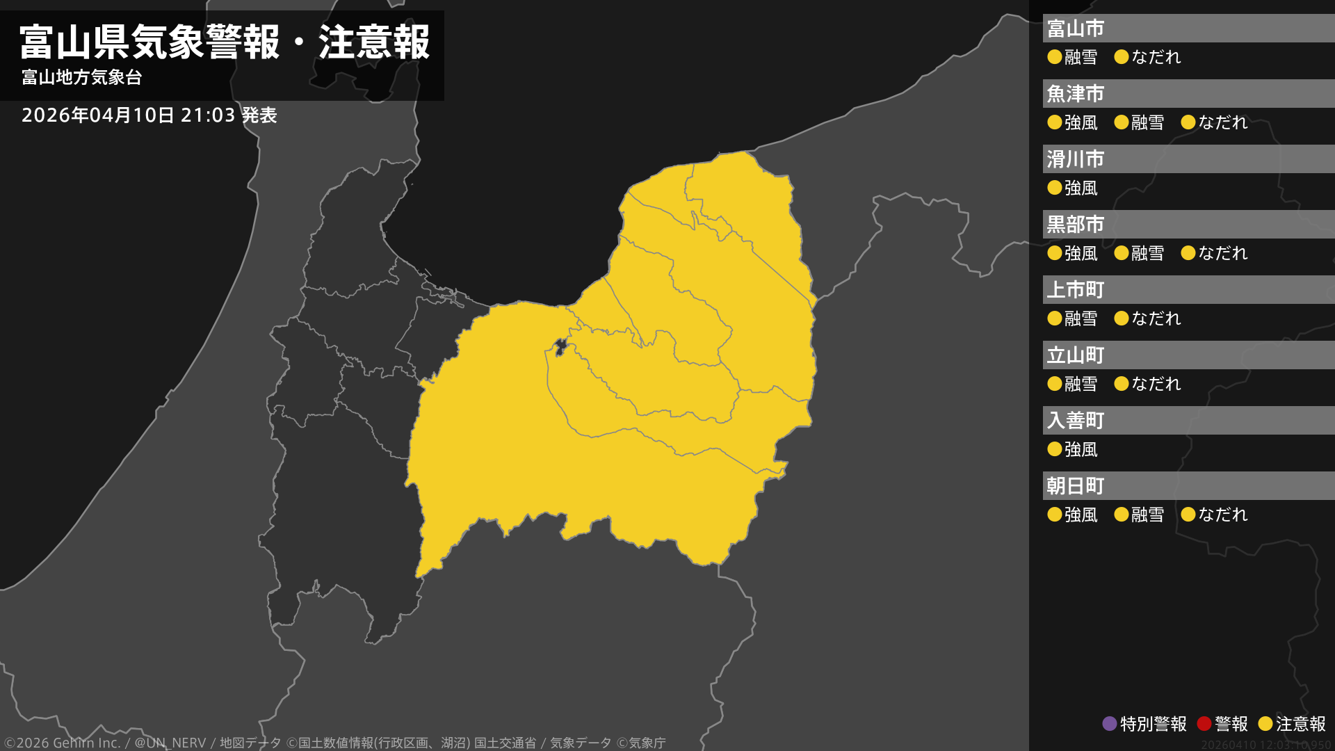 【富山県 気象警報・注意報 2026年04月10日 21:03】東部では、11日夜のはじめ頃まで強風に、11日夜遅くまで融雪による土砂災害に、ここしばらくなだれに注意してください。#気象警報注意報 #富山県