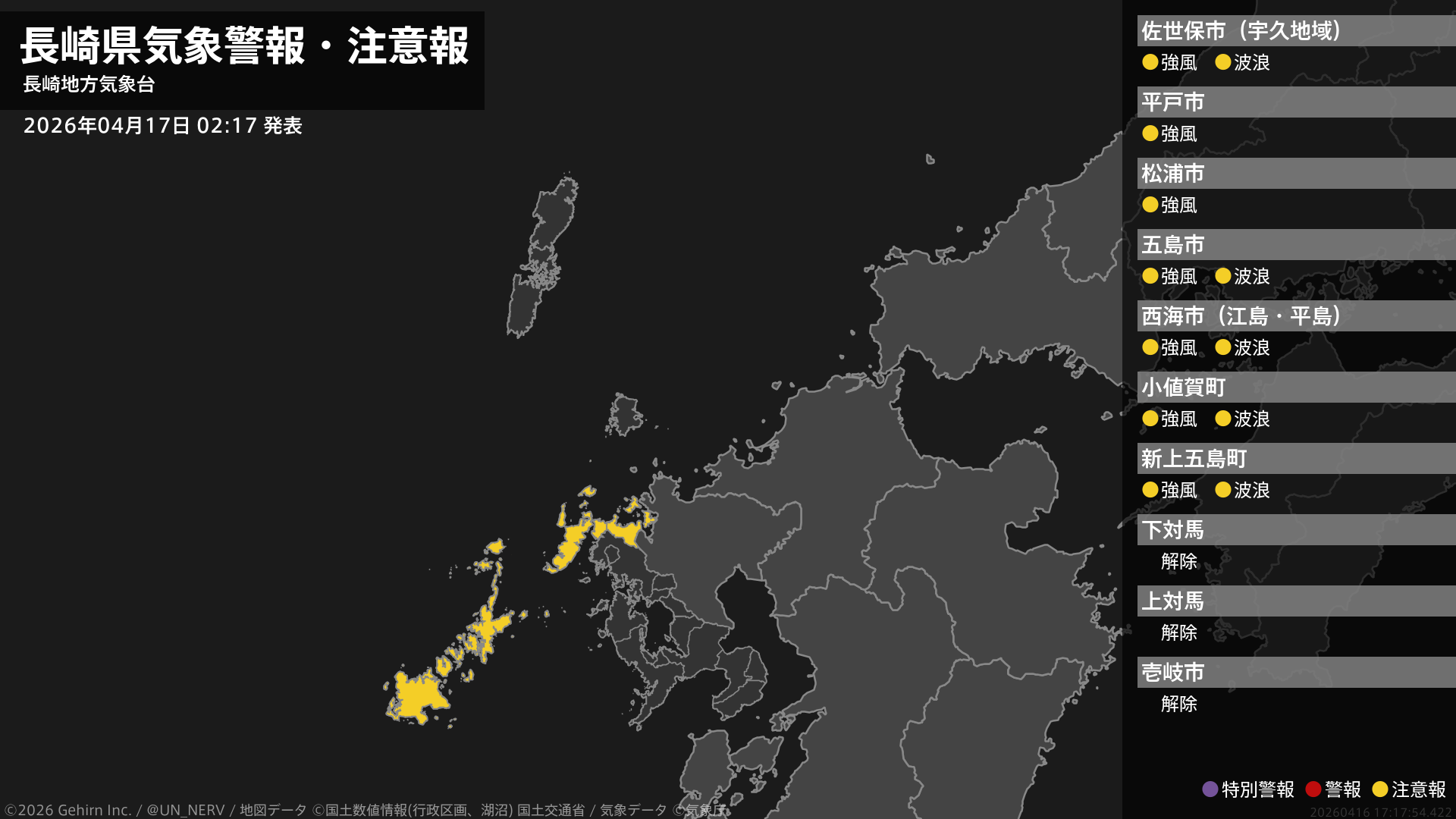 【長崎県 気象警報・注意報 2026年04月17日 02:17】北部、五島では、17日朝から18日未明まで強風に注意してください。五島では、17日朝から高波に注意してください。#気象警報注意報 #長崎県